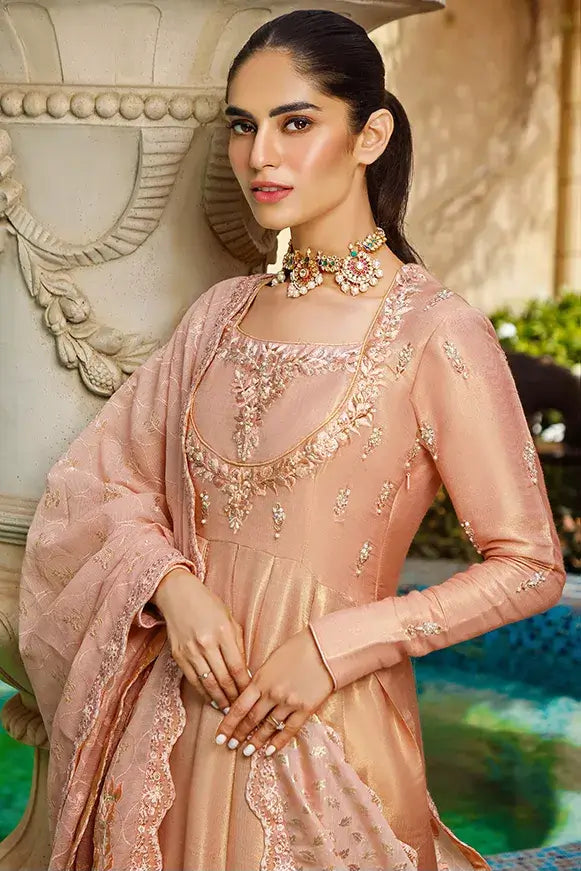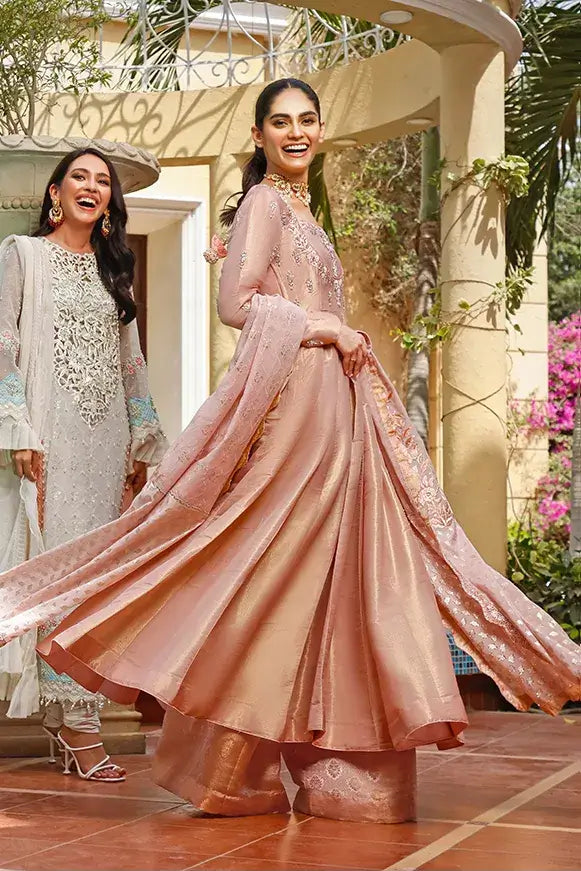 This outfit has been beautifully designed on Lame fabric alongside self thread embroidery. It's scintillating tinge represents the power to raise your self esteem and helps you to live in a constant state of joy and happiness. It has been paired with heavy embellished dupatta and jamawar pants.