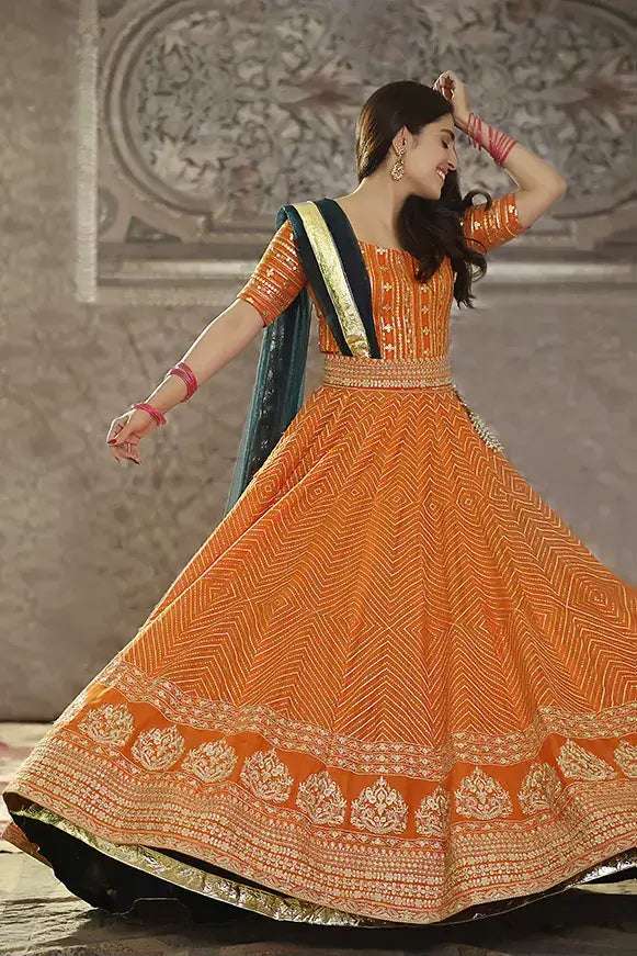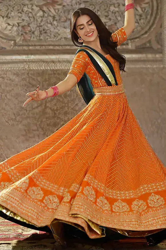 Ayezah khan has blown the audiences with Noori look from Superstar in her play laapata. We created this beautiful outfit on silk. It is a double layered fully embroidered lehnga choli with thread and sequence work. It is paired with Indian goata net dupatta