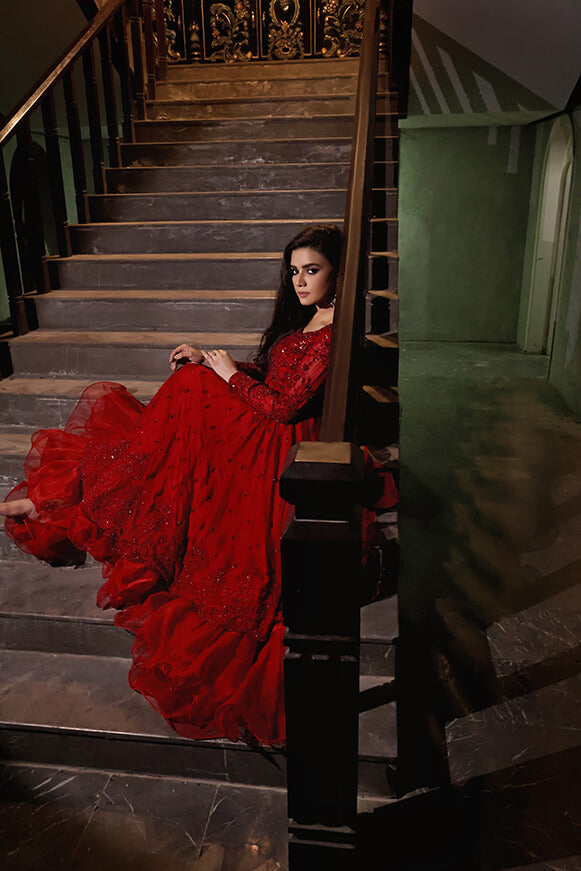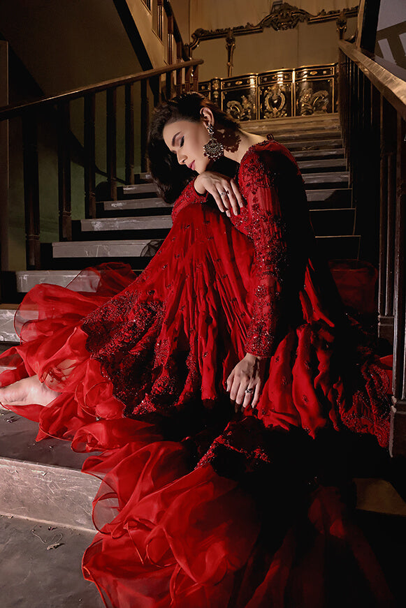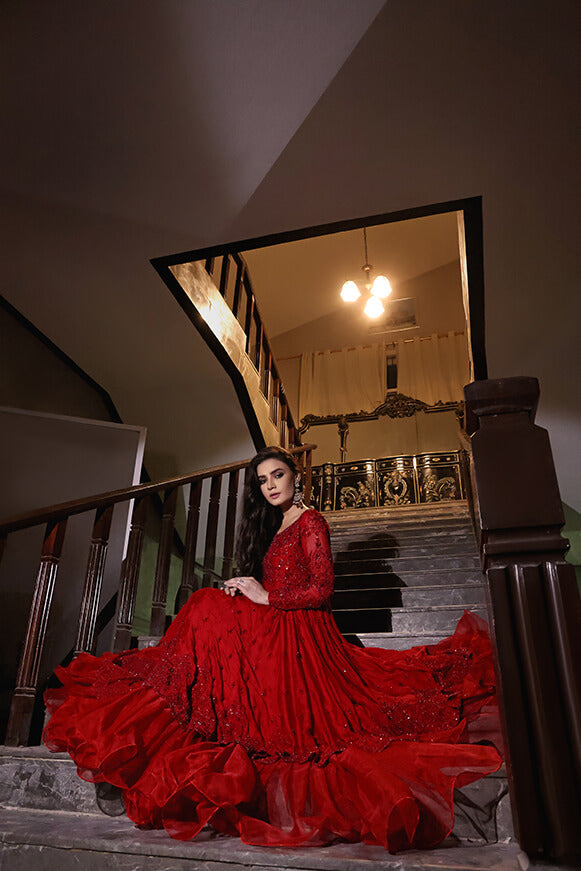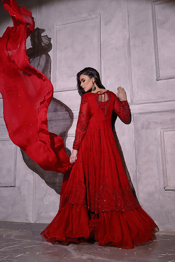 Red wine silk chiffon pishwas with detailed handwork on bodice and sleeves and on flarepired with organza ruffled lehnga and 3.5 yards of duappat with scallop details and chan Colour along with work can be customized.