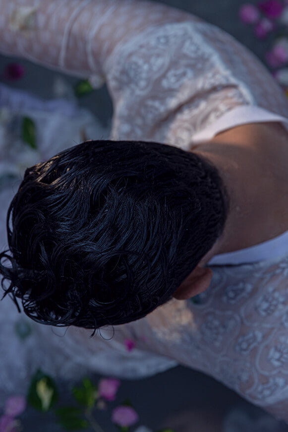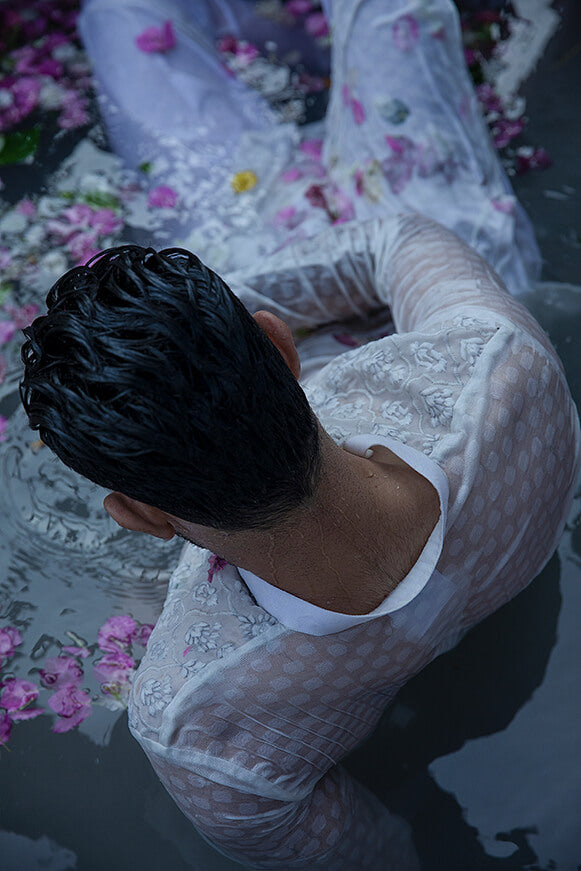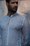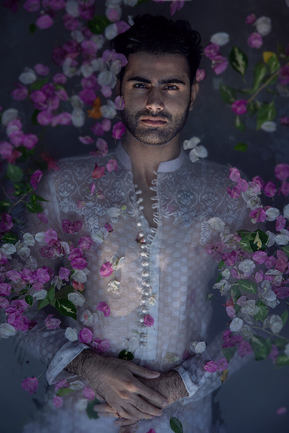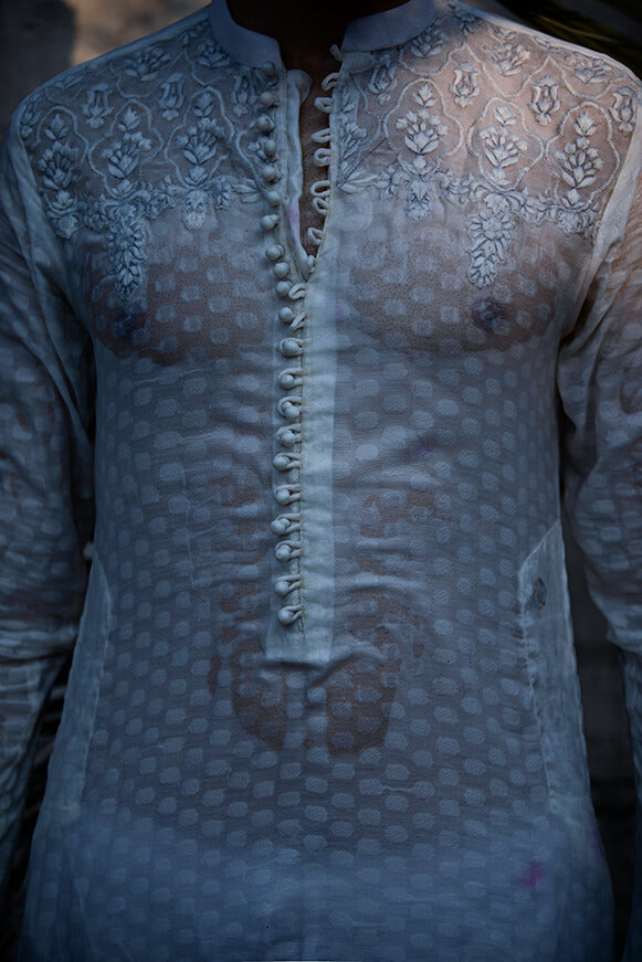 Fabric self cotton khaddi Colour pearl white Self thread work on shoulder and on neck line Paired with cotton trouser Colour customisation is possible.
