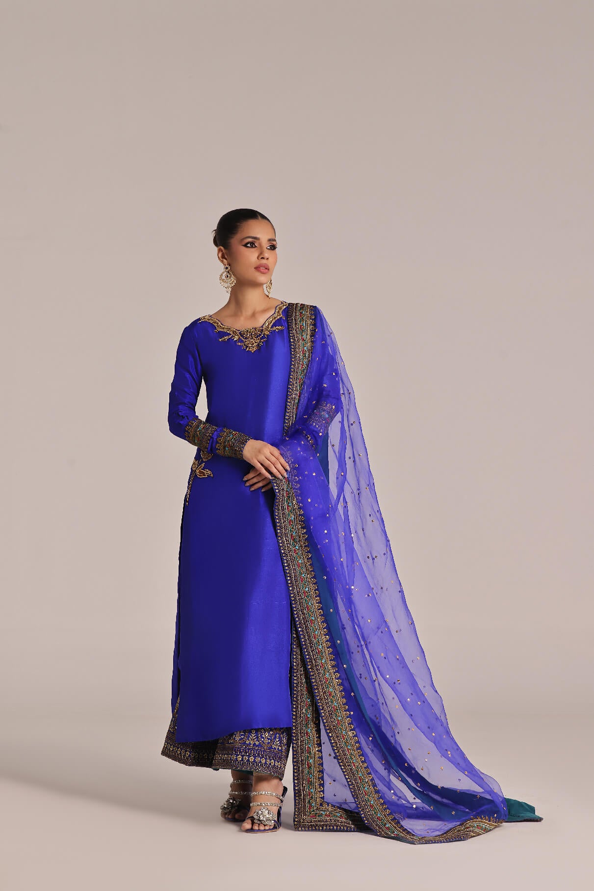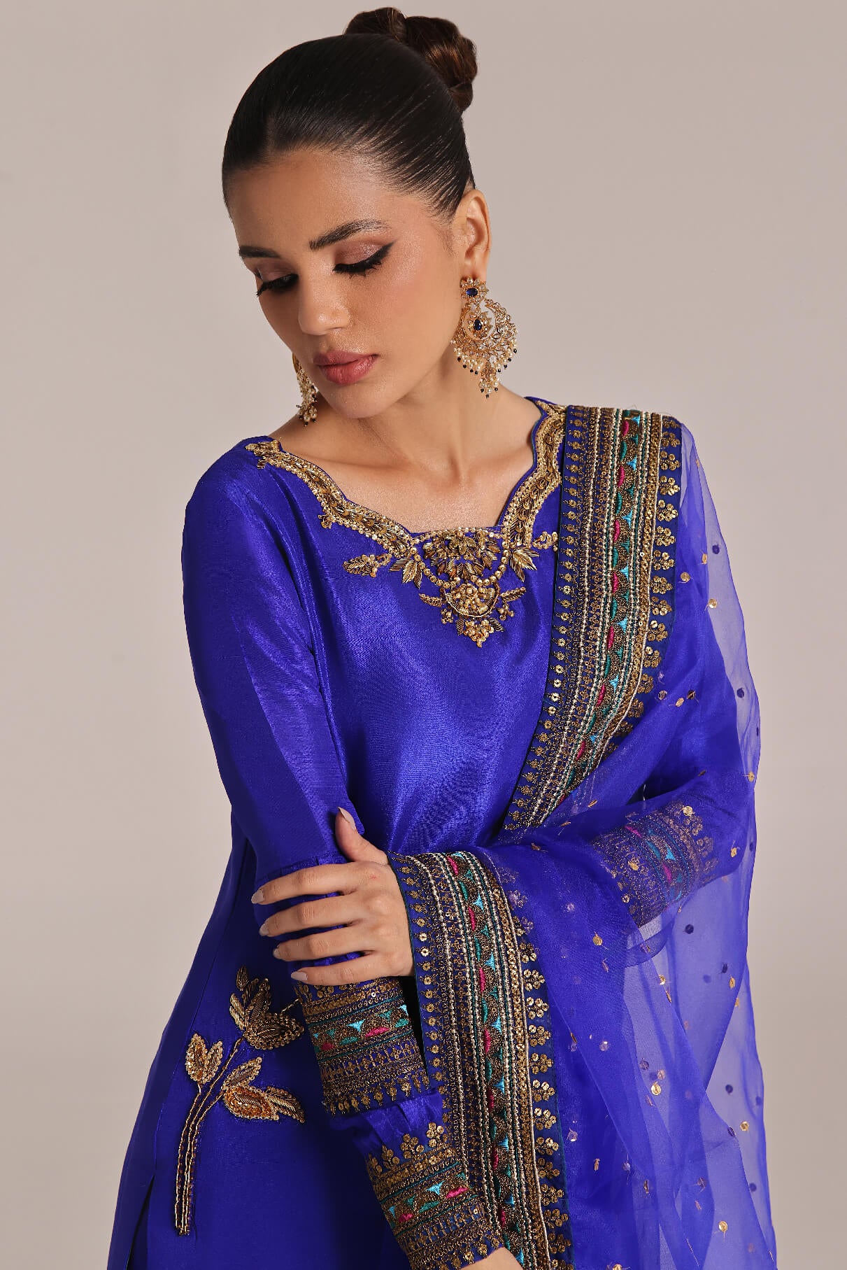 This radiant Blue Pure silk article with chic cut adda work on neck line and on front with silk organza dupatta four side borders and sequence spray all over paired with loose izaar with embroidery border.