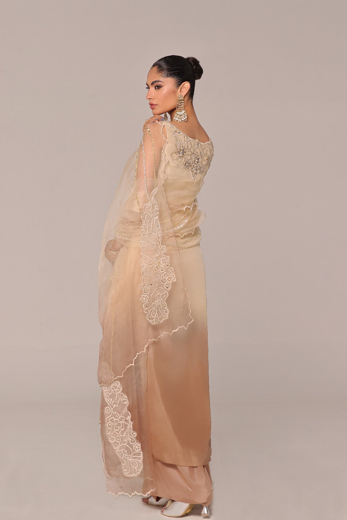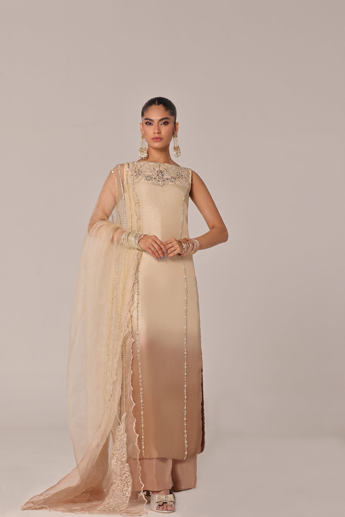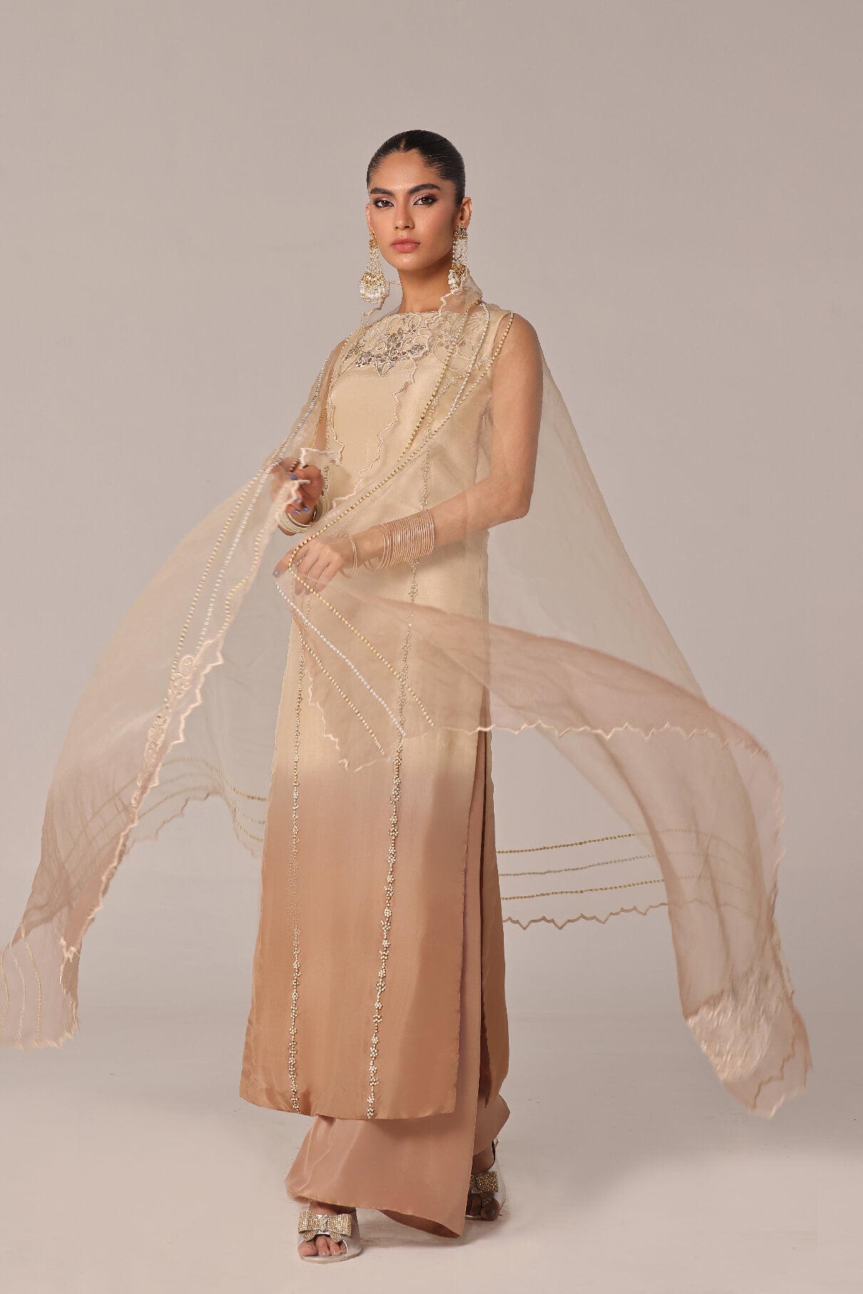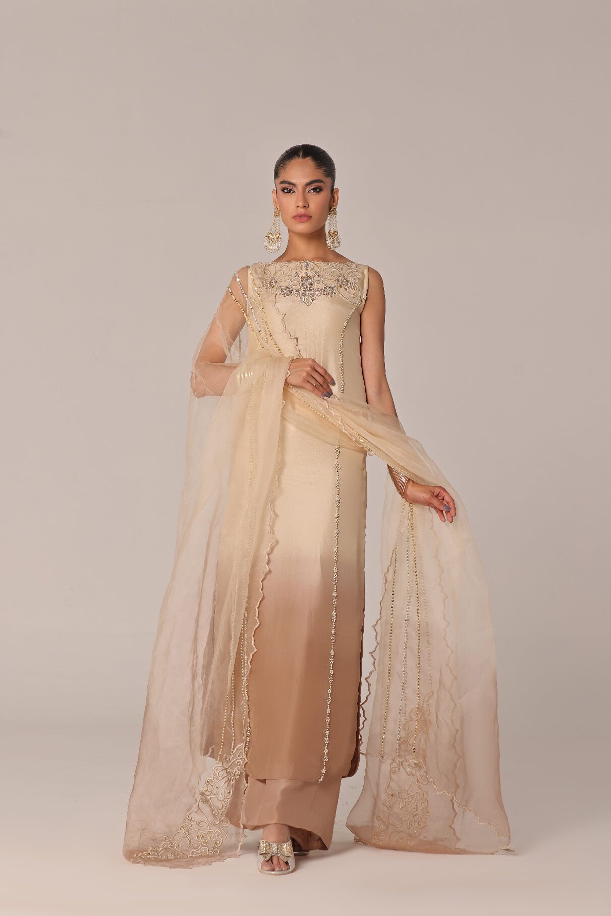 Cool brown rawsilk long straight shirt with plazo with detailed and intricate hand work on front & back neck line & to make more chic. Intricate handwork lines given on front paired with pure organza dupatta with hand work on two sides bunches.