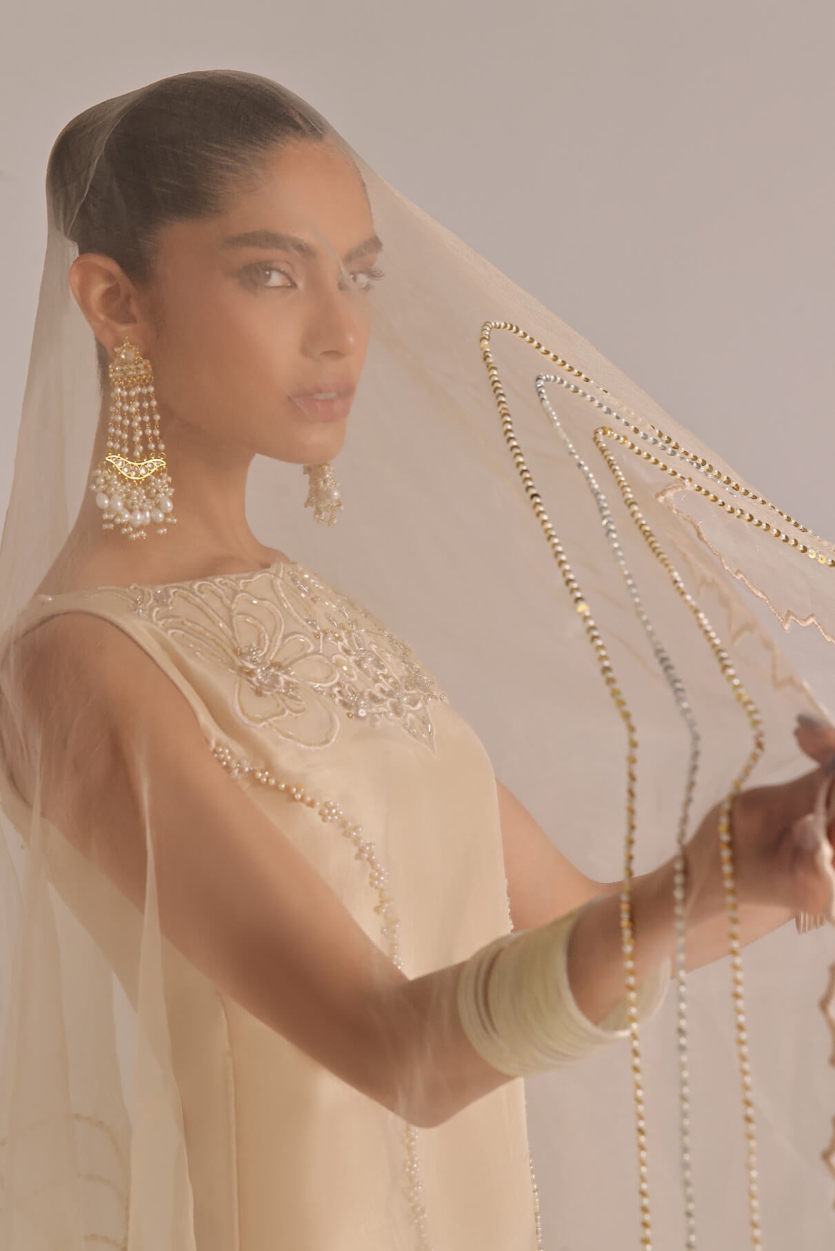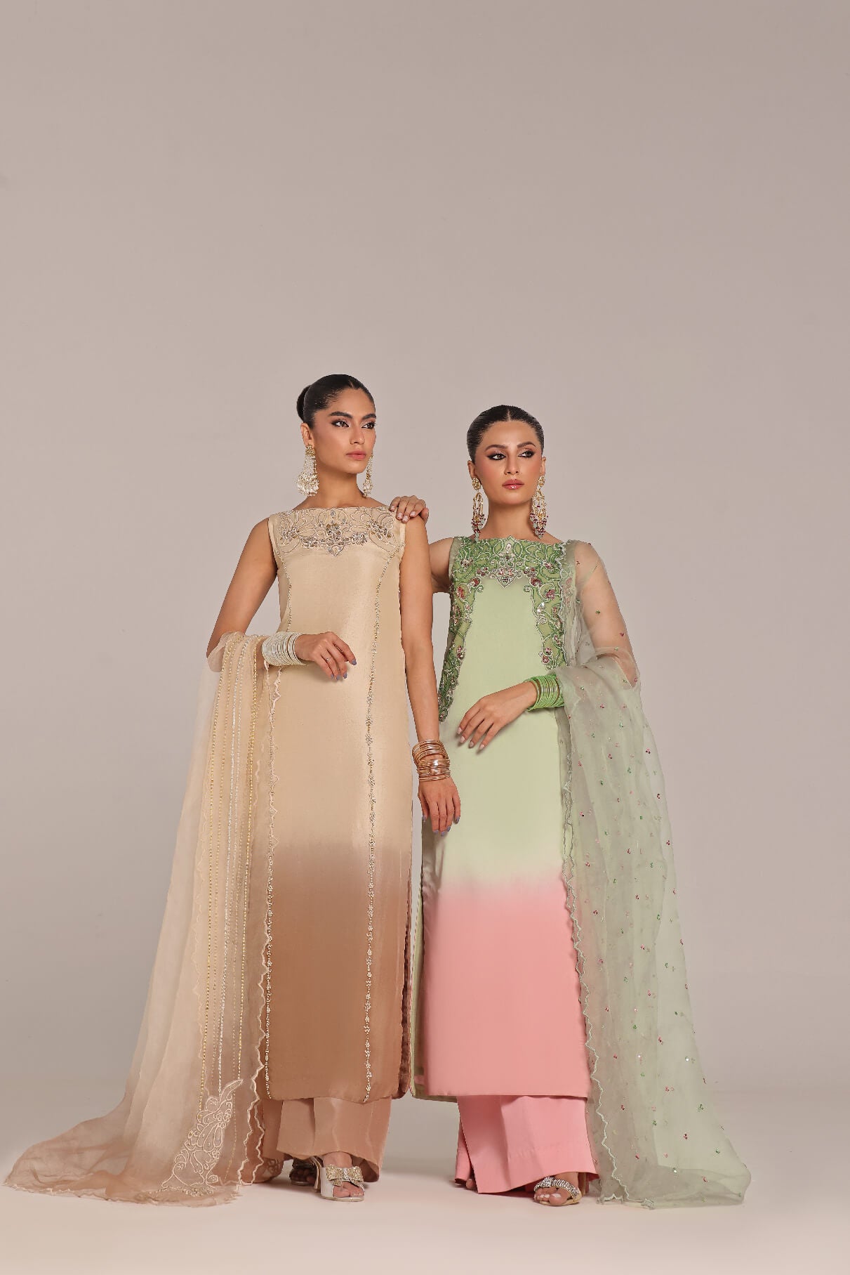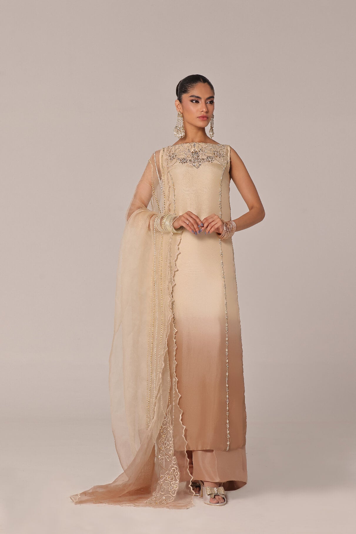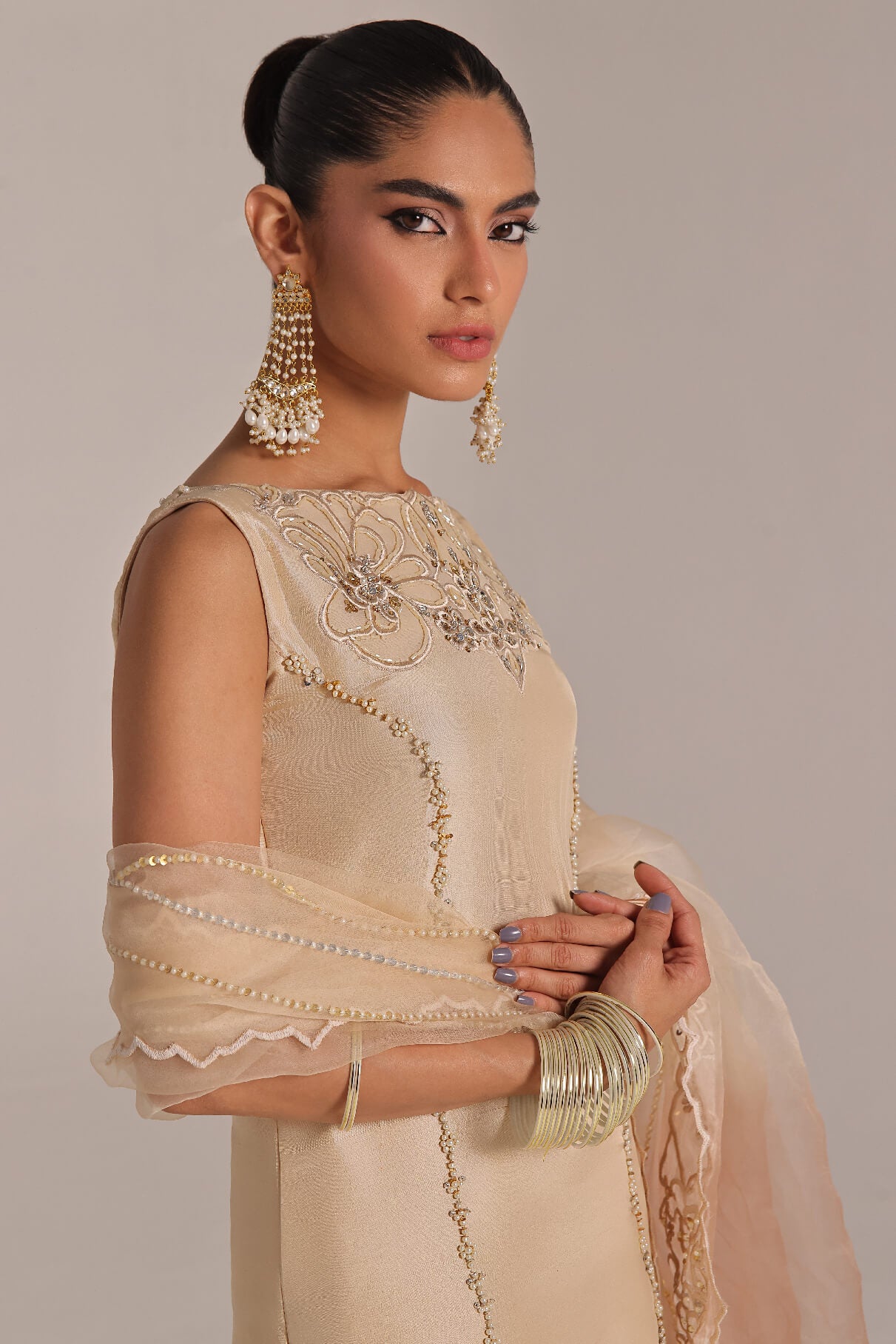 Cool brown rawsilk long straight shirt with plazo with detailed and intricate hand work on front & back neck line & to make more chic. Intricate handwork lines given on front paired with pure organza dupatta with hand work on two sides bunches.