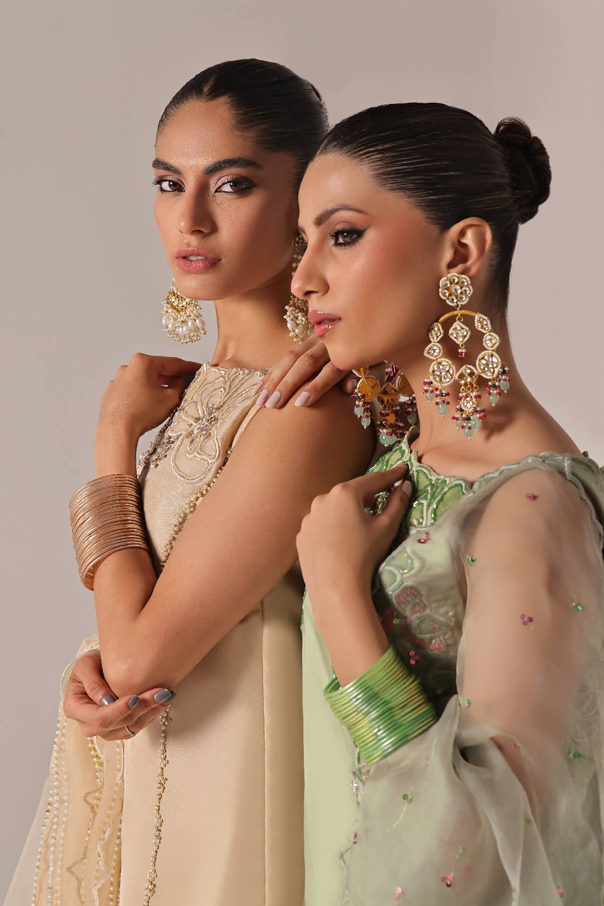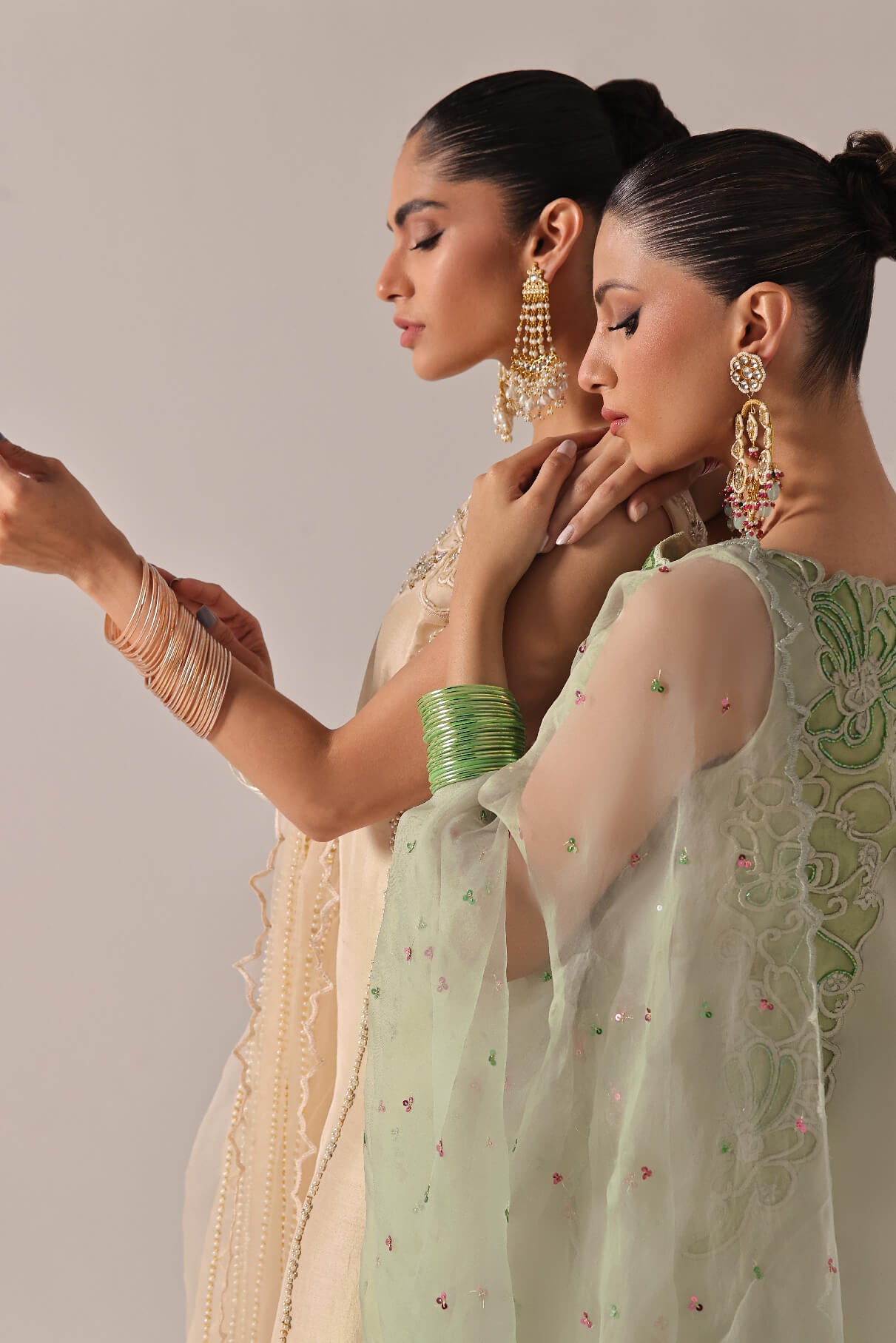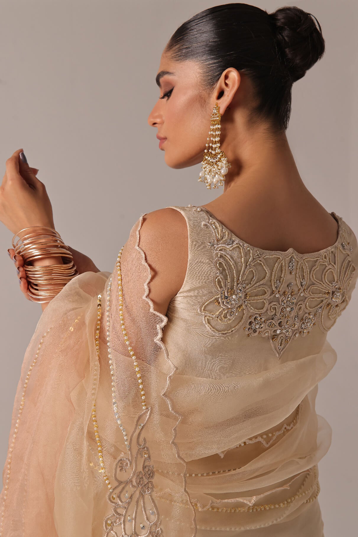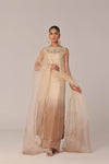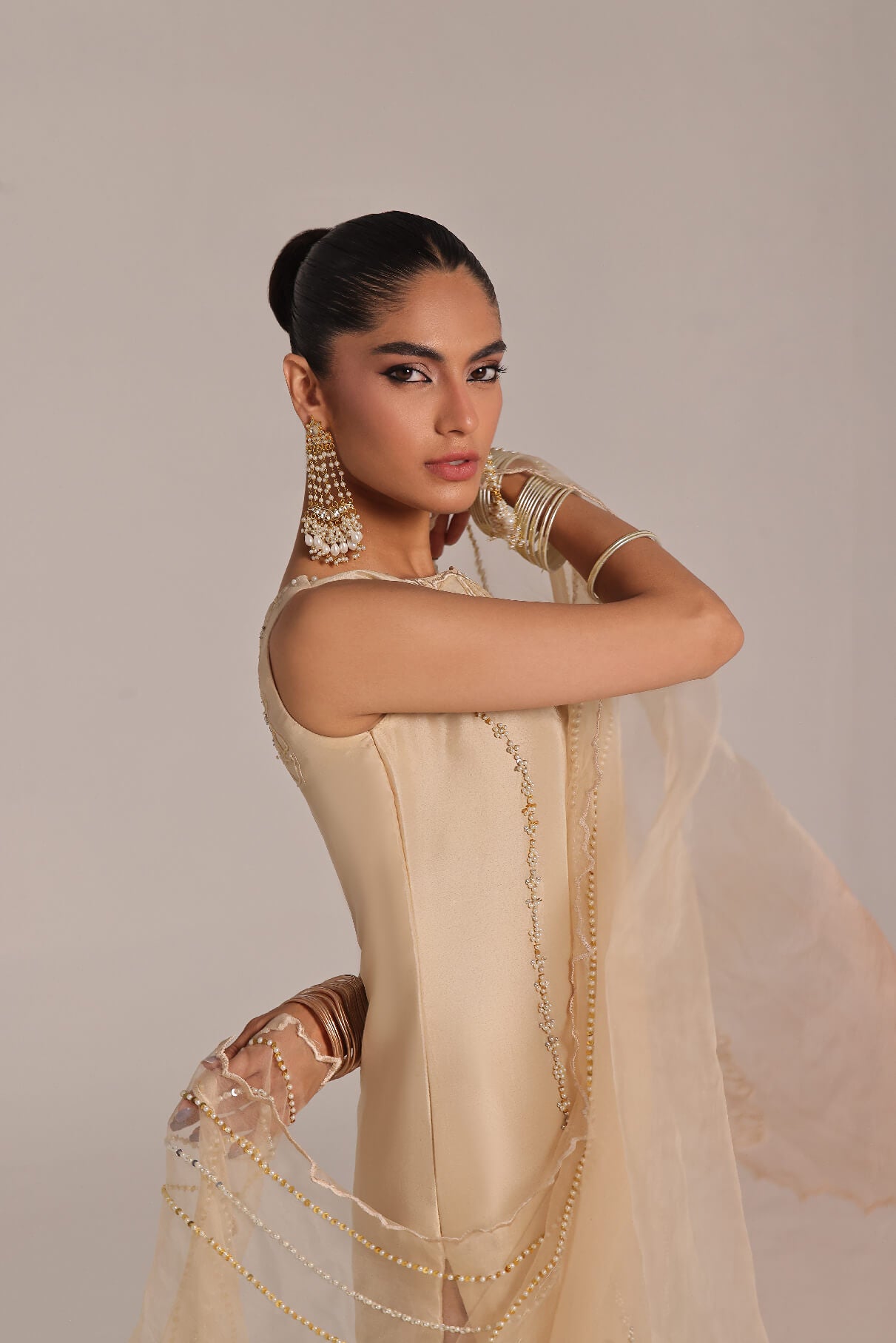 Cool brown rawsilk long straight shirt with plazo with detailed and intricate hand work on front & back neck line & to make more chic. Intricate handwork lines given on front paired with pure organza dupatta with hand work on two sides bunches.