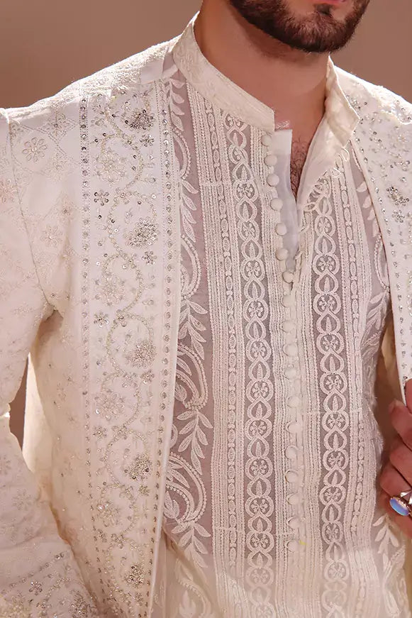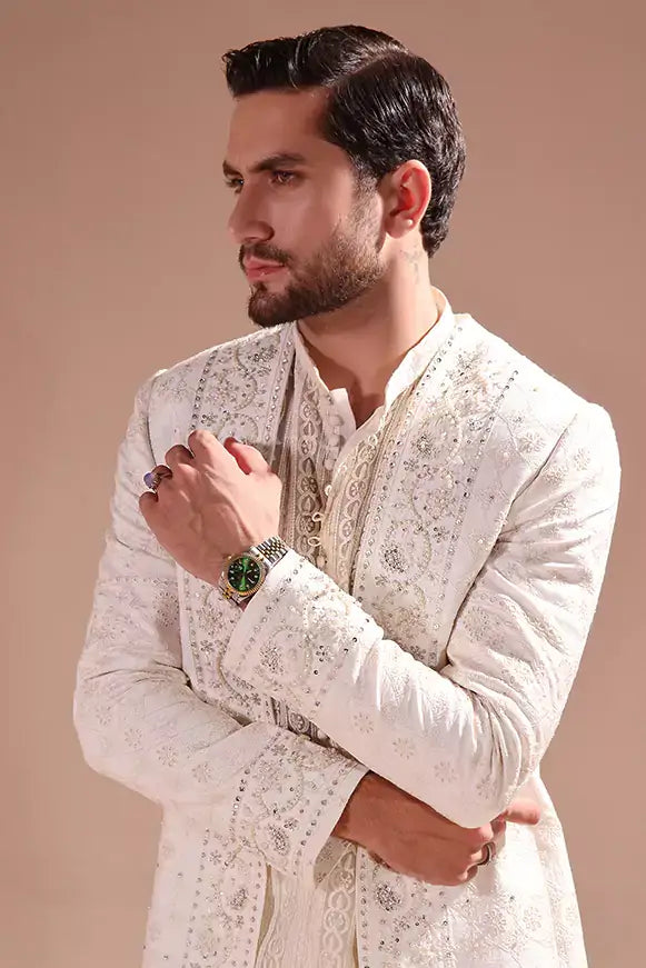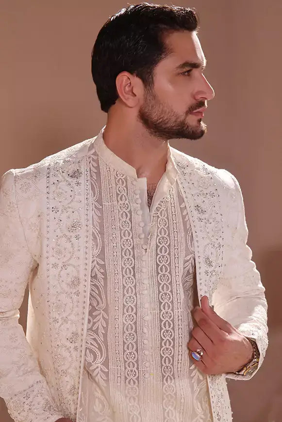 A modern touch with classic cut & detailed adda work prince coat with sheer embroidered organza shirt inside and elegantly embroidered bell bottom pants to create a chic look.