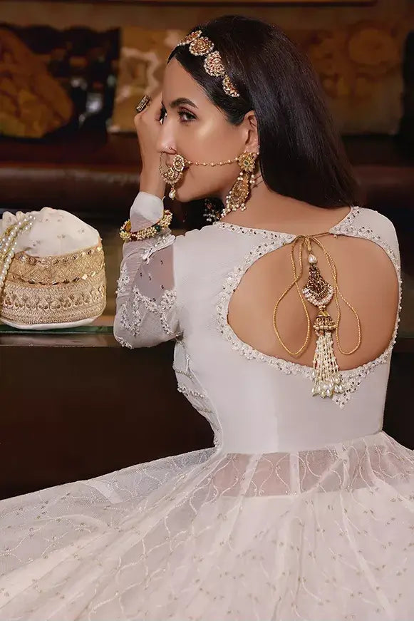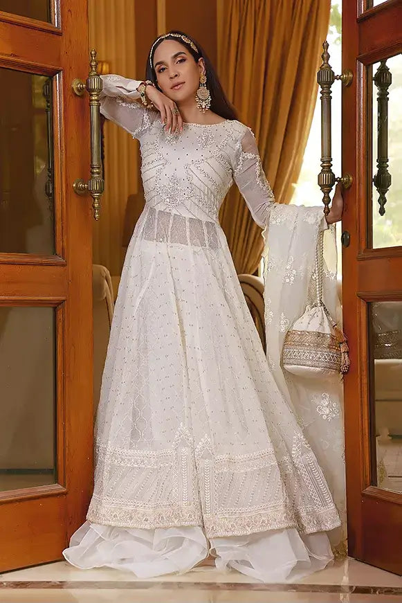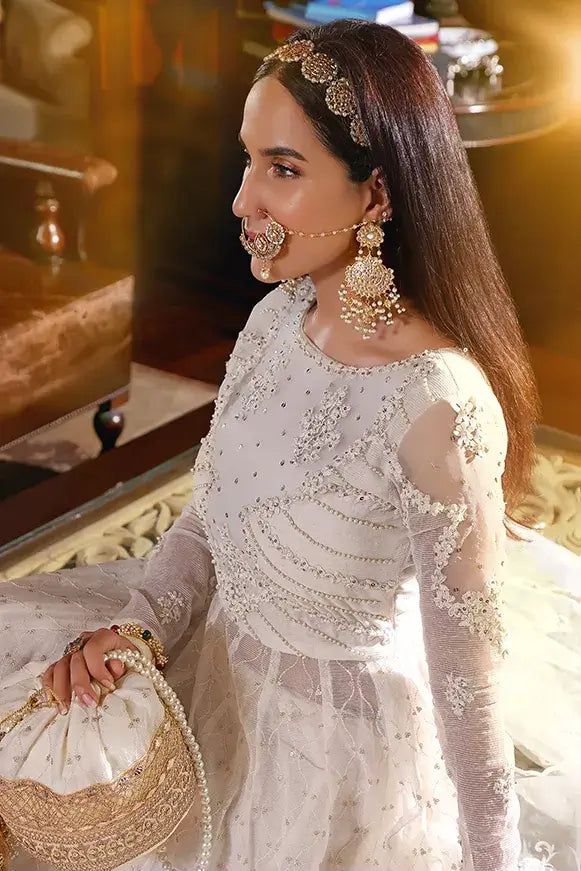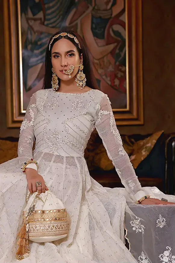 Cotton karandi finery pishwas hand embellished body and intricately embroidered flair, paired with 3.5 yard embroidered dupatta and ruffled lehnga.