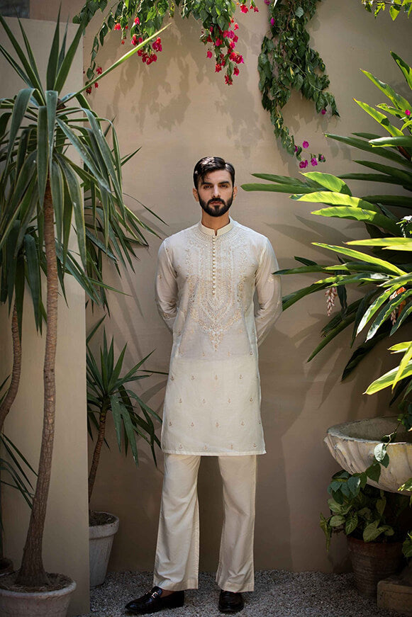 The intricate embroidery on the kurta showcases the skill and dedication of master artisans, making it a true work of art. The detailed patterns reflect the rich cultural heritage of the Mughal era, bringing a piece of history into your modern wardrobe. AZAJ is ideal for the discerning gentleman who values tradition, craftsmanship, and style.