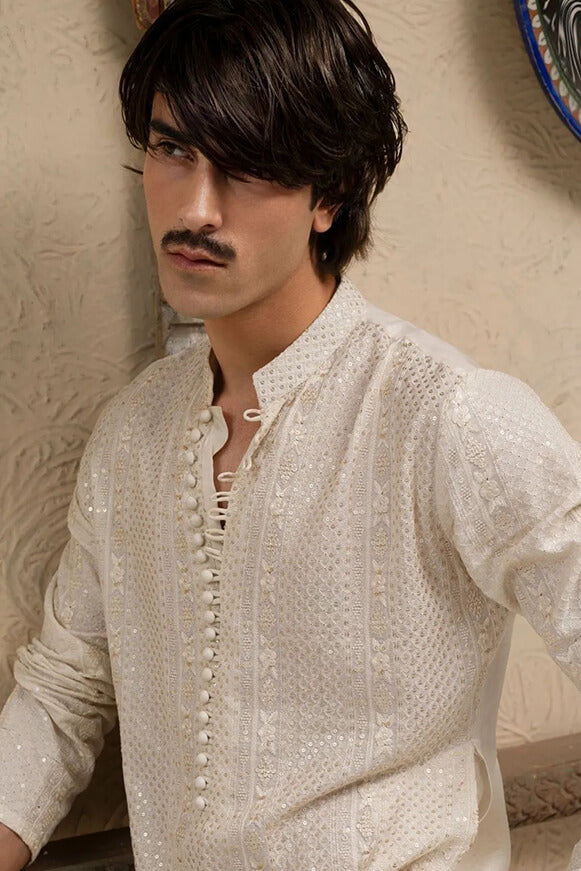Presenting the inaugural masterpiece from our latest menswear collection, 'Nawabzaday'-introducing "Kais". Inspired by the timeless elegance of traditional Pakistani attire, this refined ensemble radiates luxury and heritage. With meticulous craftsmanship and exquisite detailing, every stitch of "Kais" narrates a tale of grandeur and refinement. As the heavens and earth merge in celestial harmony, immerse yourself in the splendor of "Kais" by Wajahat Mansoor. Experience the essence of reimagined royalty, designed for the modern gentleman. Enter a realm where tradition meets innovative style, where each garment is a tribute to enduring sophistication. Elevate your wardrobe with "Kais" and embrace a legacy of elegance.