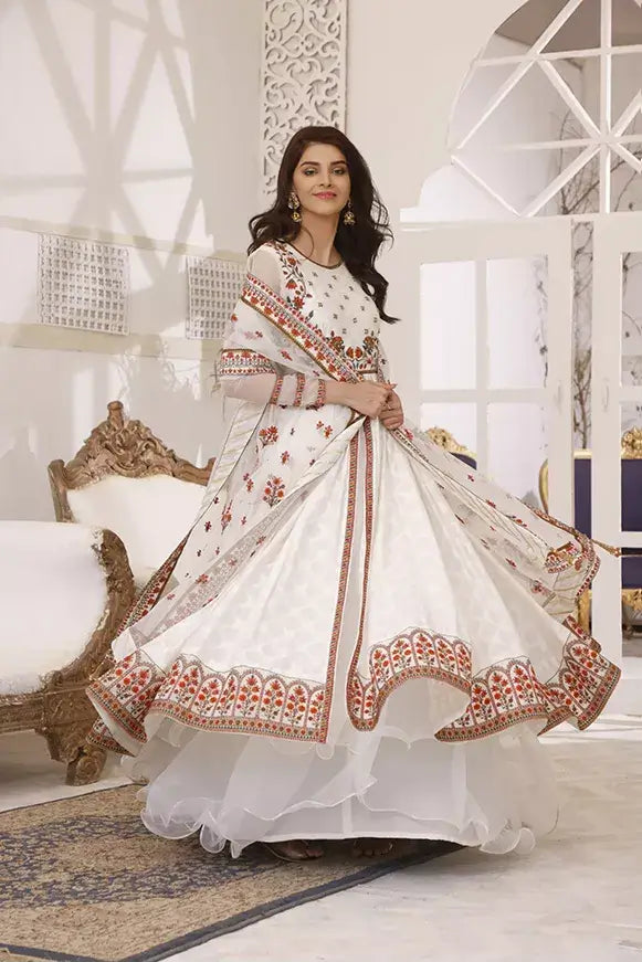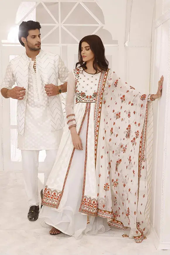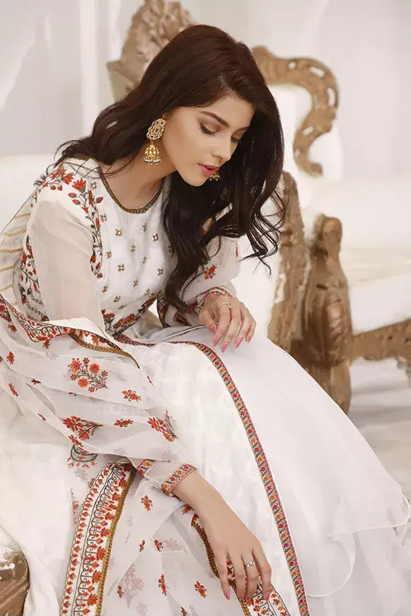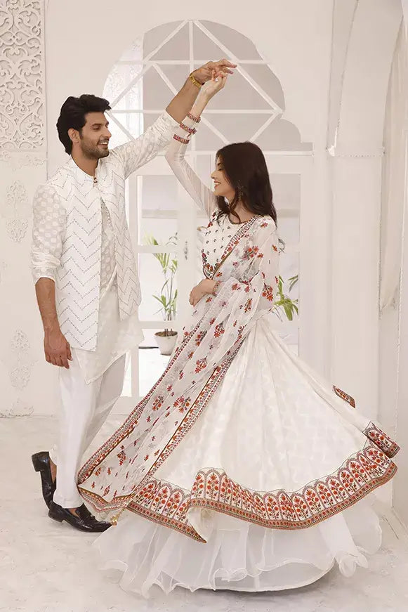 Curated on self khaddi made baroque with handwork. It is paired with fully embroidered organza dupatta and ruffled organza lehnga. We do not believe in standard measurements so, it will be crafted according to your size chart. Please provide us your accurate size measurements to be treated like Cemile.