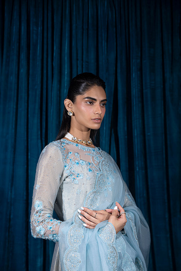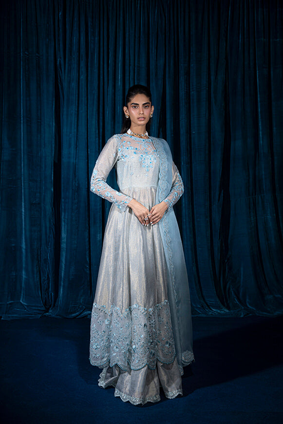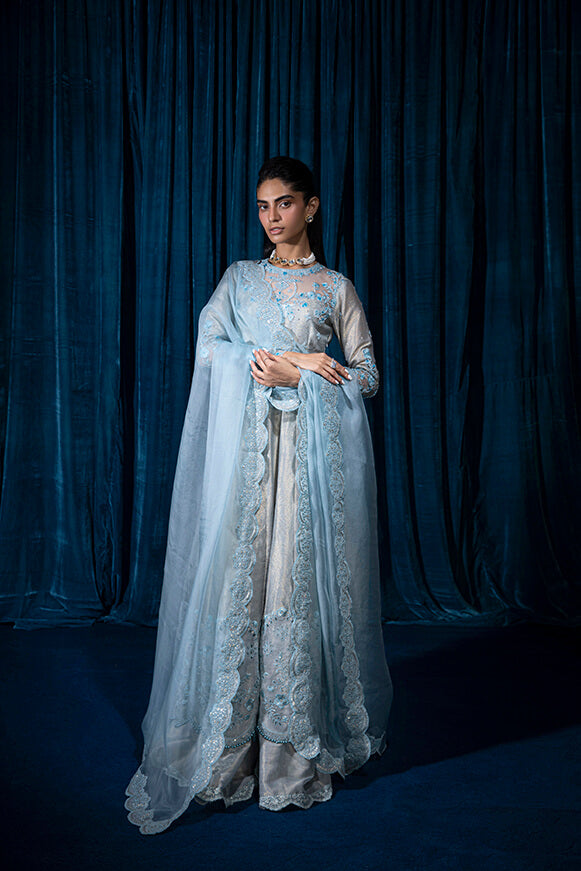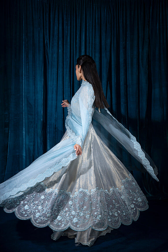 Mysori pishwas with beautiful organza patch work embellished with stones crystals and pearls paired with 3 yards of organza dupatta and four side borders.