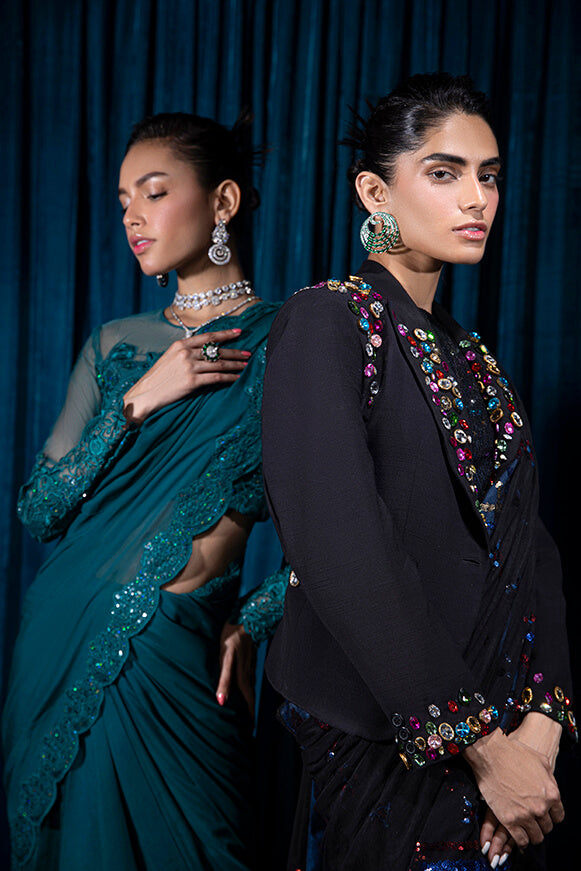 An extravagant vista of our regalia collection, sleekness & artistry merged together. Tailored to perfection, net saree is a picturesque statement piece. Coat is embellished with our very best selection of premium stones to make it stand out.
