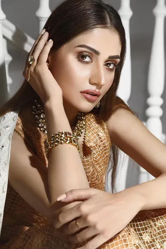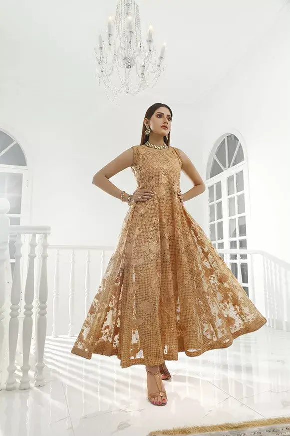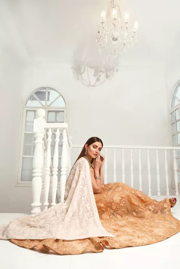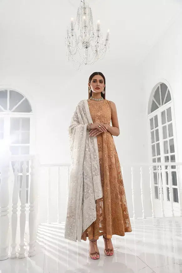 Pishwas Composed on Self chequered organza channeled with thread and sequence work. You can pair it with Chiffon dupatta with chickenkari and mirror work.