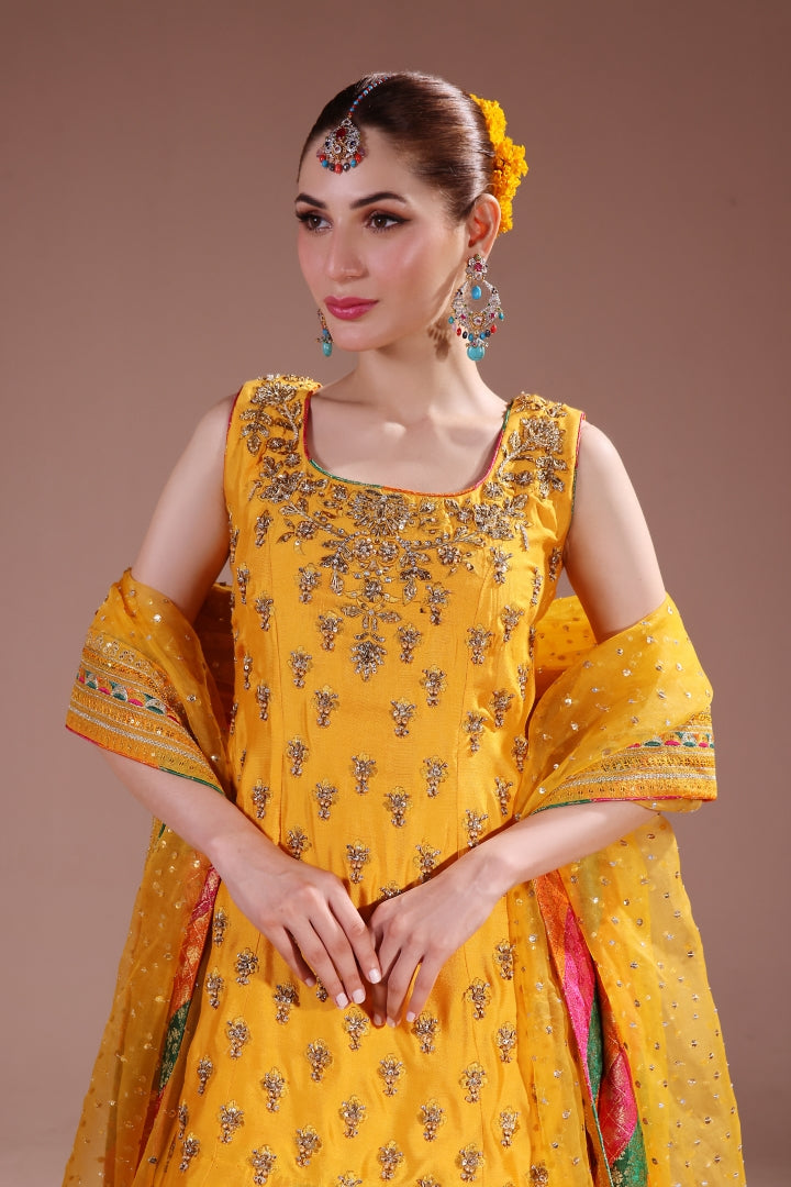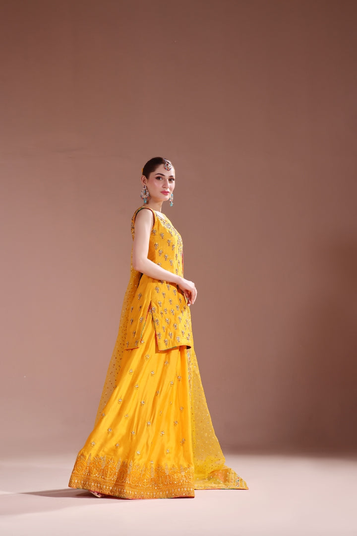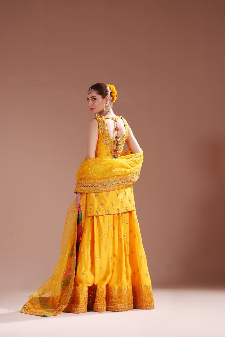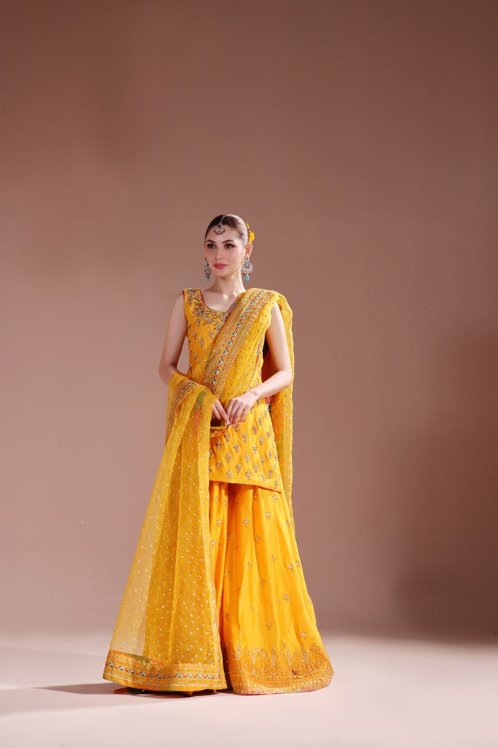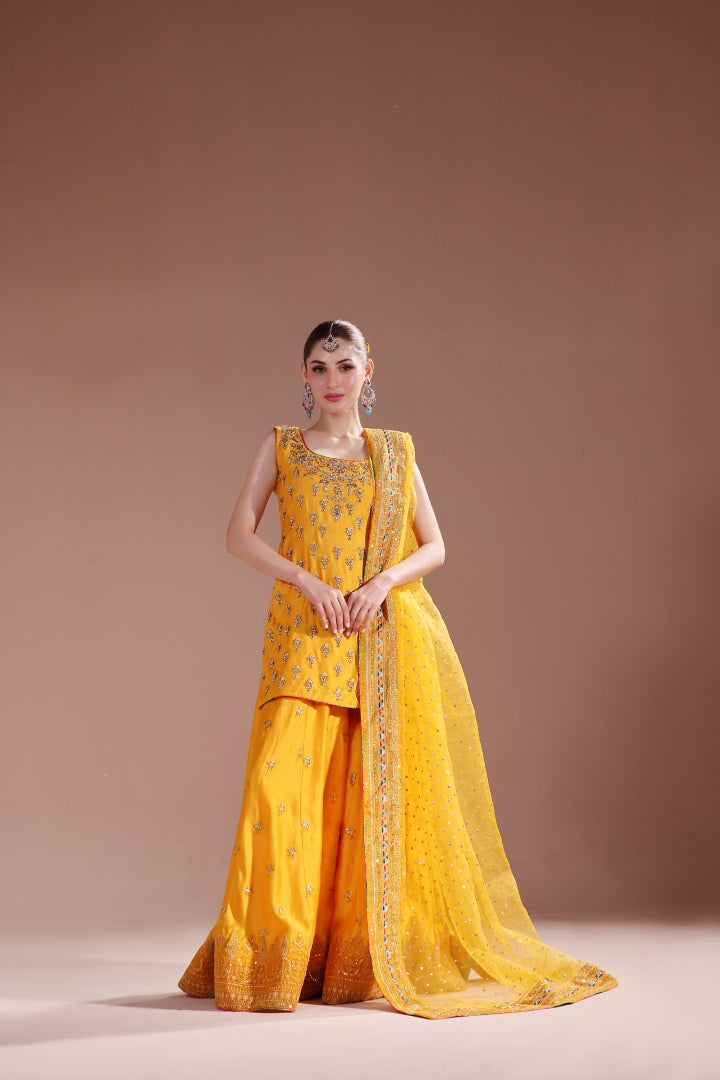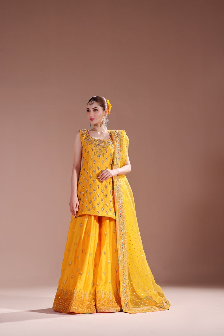 A blend of good and vibrant hues mixing these colors in chatapaty and blending into making a dreamy mehndi – mayoun outfit. Short shirt with sharara detailed handwork all over paired with 4 yards of pure organza dupatta
