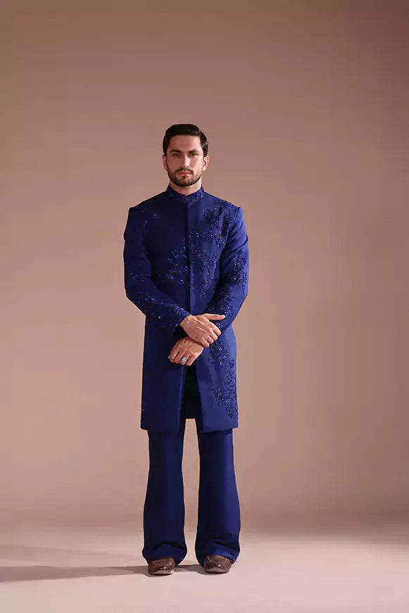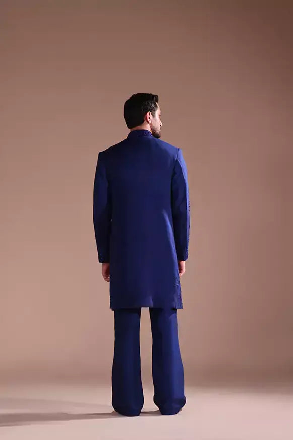 A modern take on a blue sherwani, beautifully same color adda work done to maker it look royal yet modern at the same time. Paired with bell bottom pants.