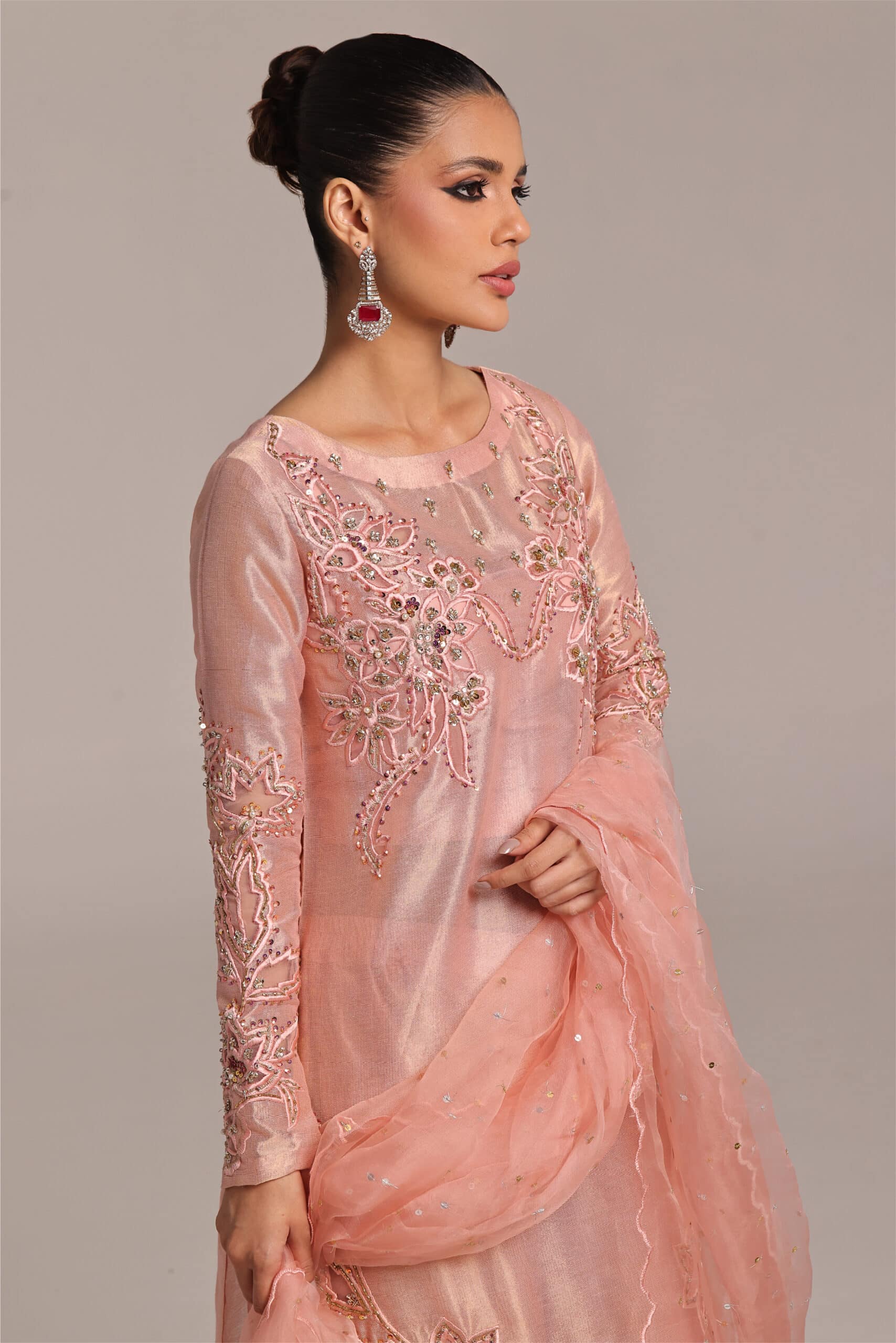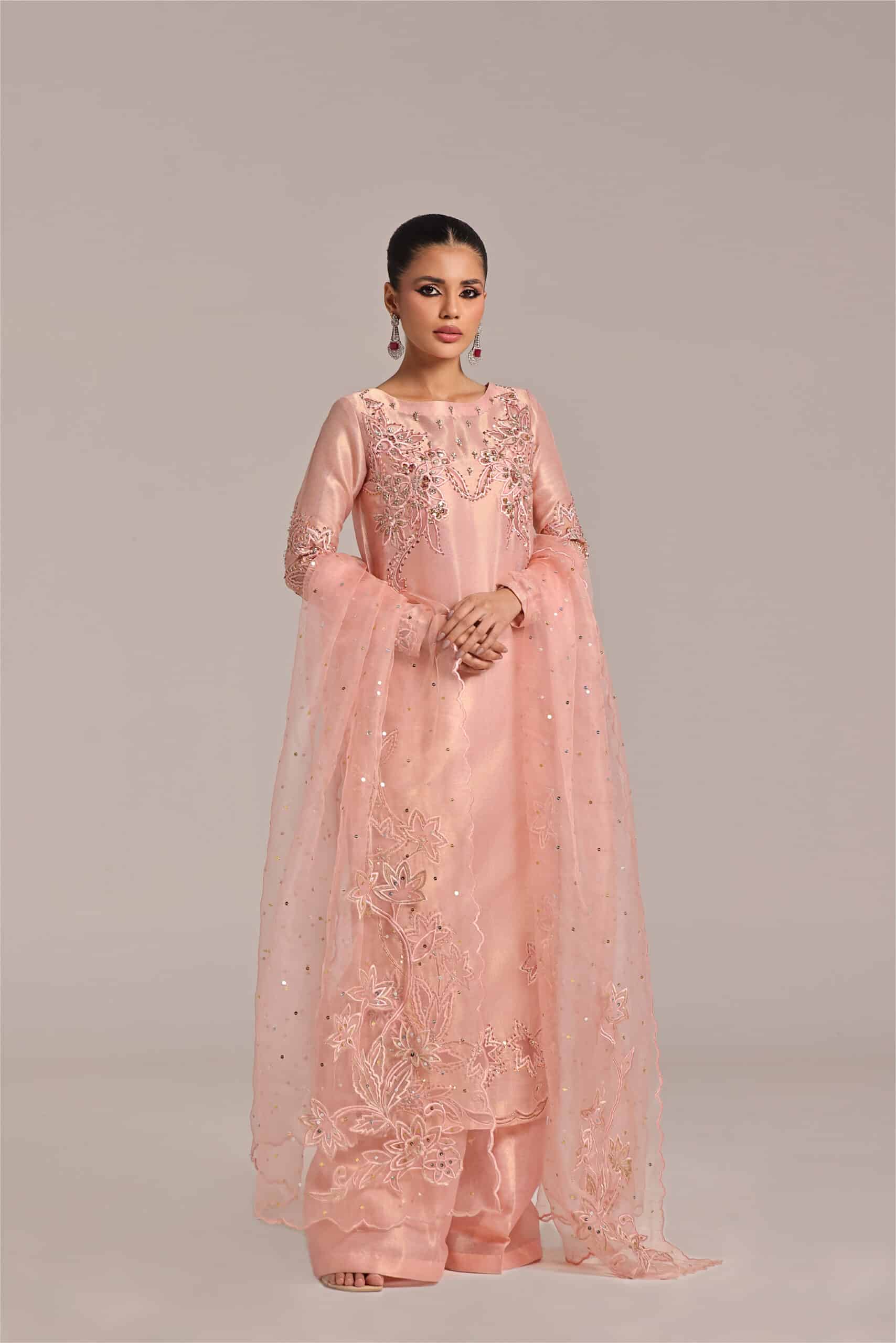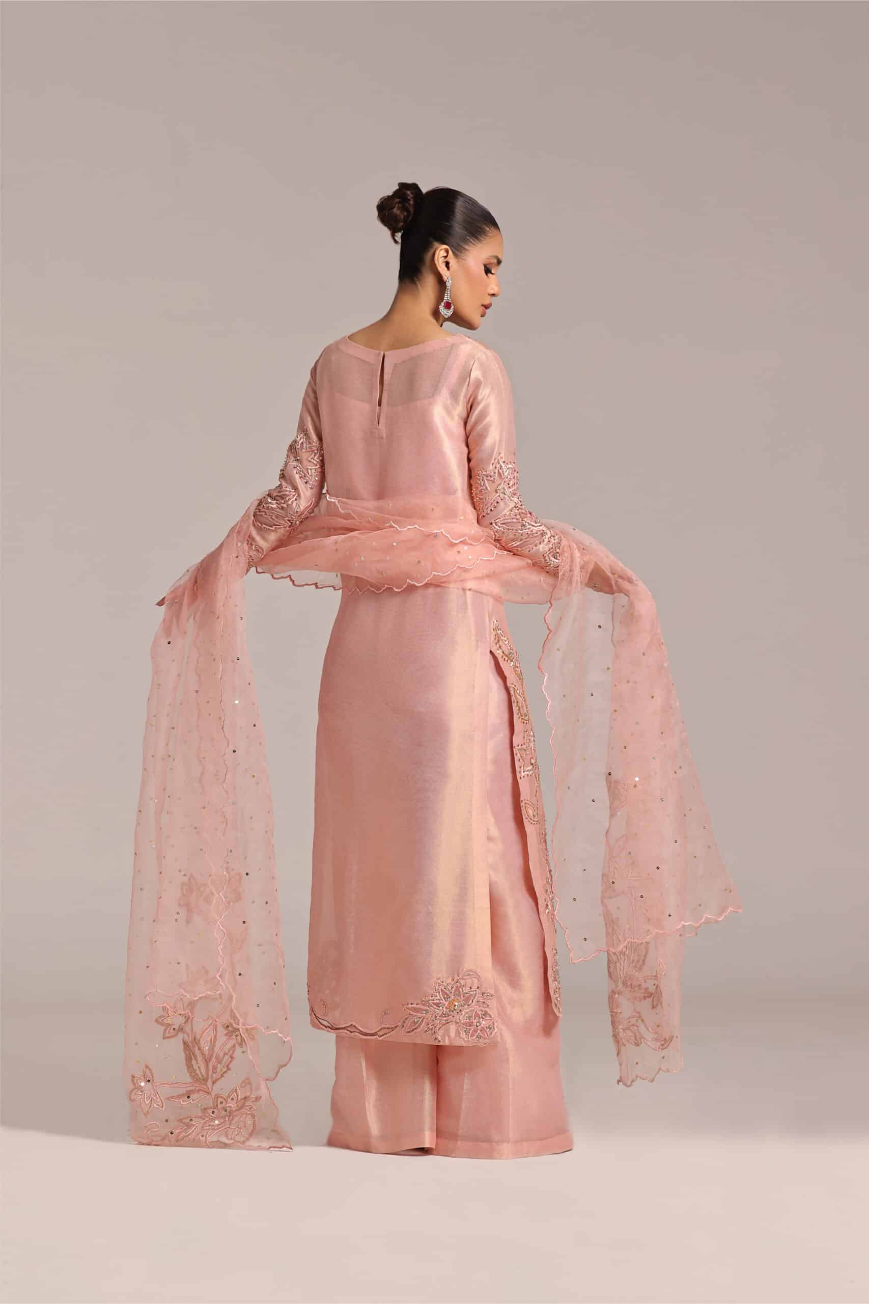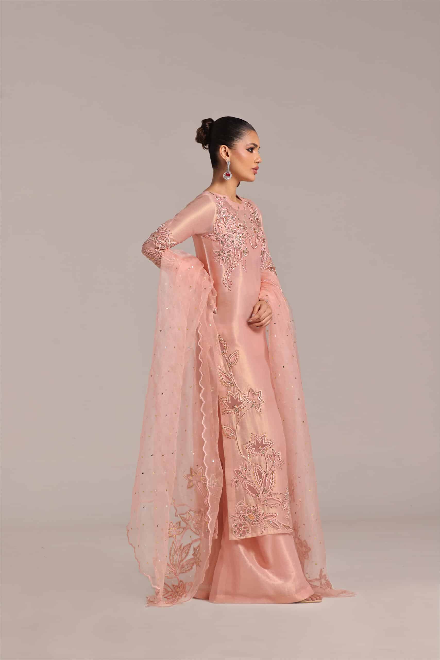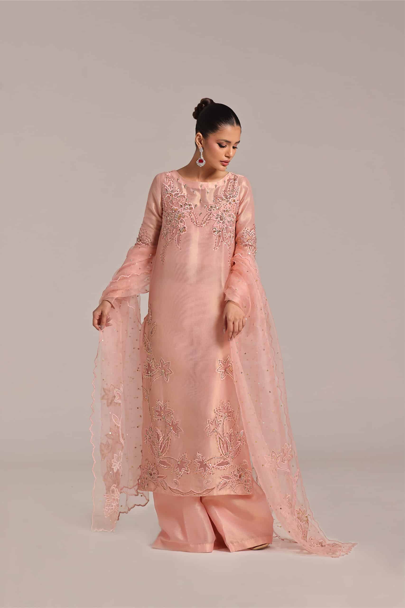 Applique work technique has been used work techniques are cutdana sequence pearls stones dabka Paired with loose trouser and pure organza dupatta with 2 side bunches and chan.