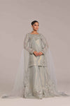 Detailed and intricate work on the front neck line and on sleeves with thread work and cutdana with pearls and beads and sequins paired with plazo pants 8 inches border on pants dupatta has sequence lines and bunches with scallops details