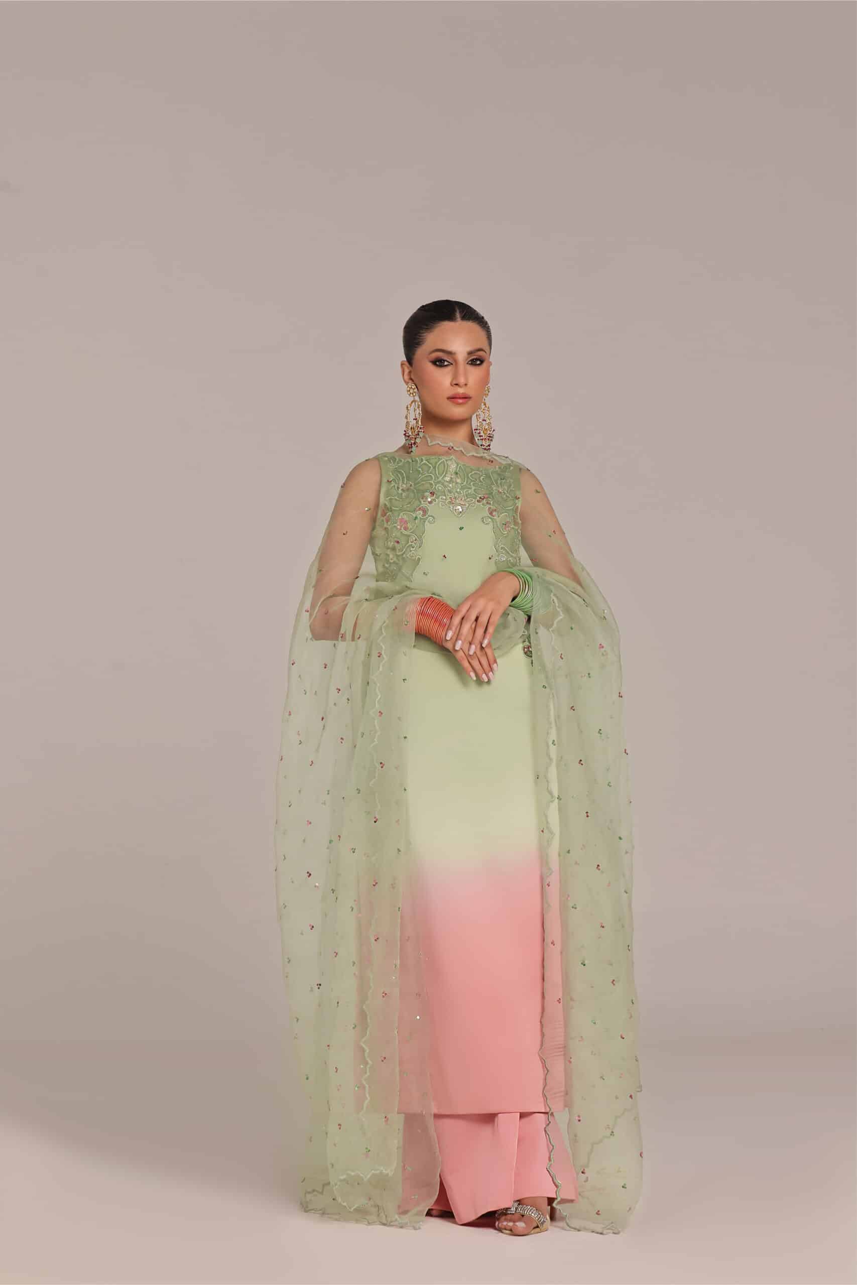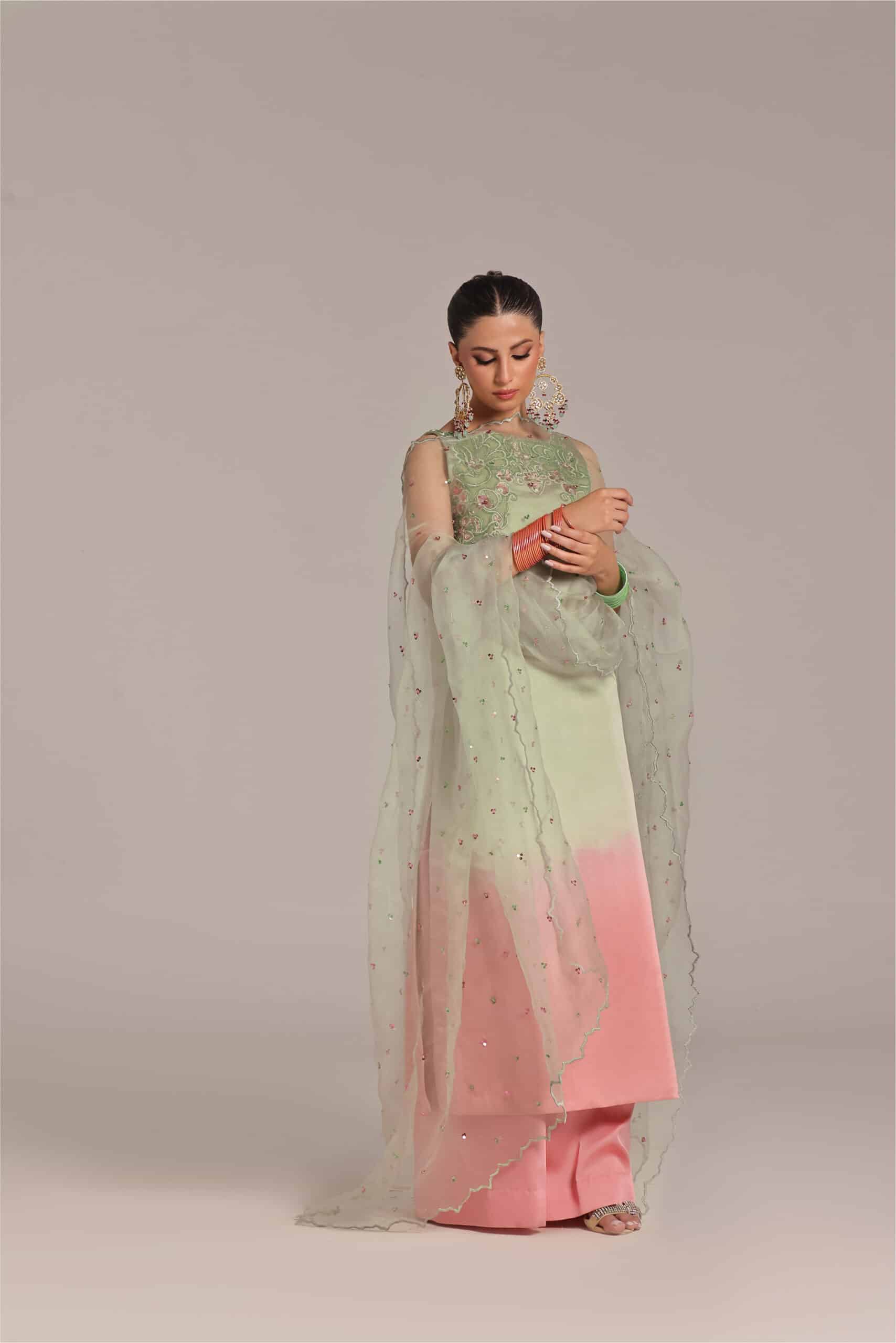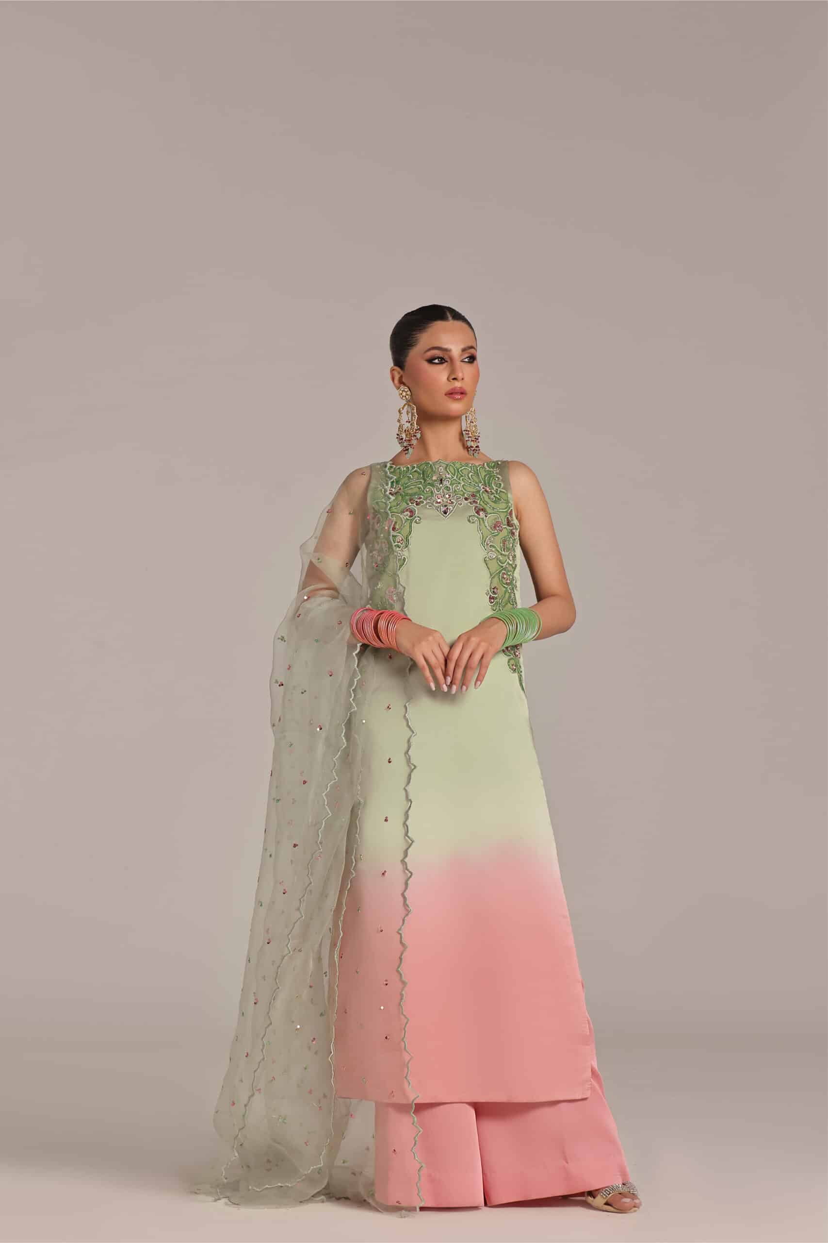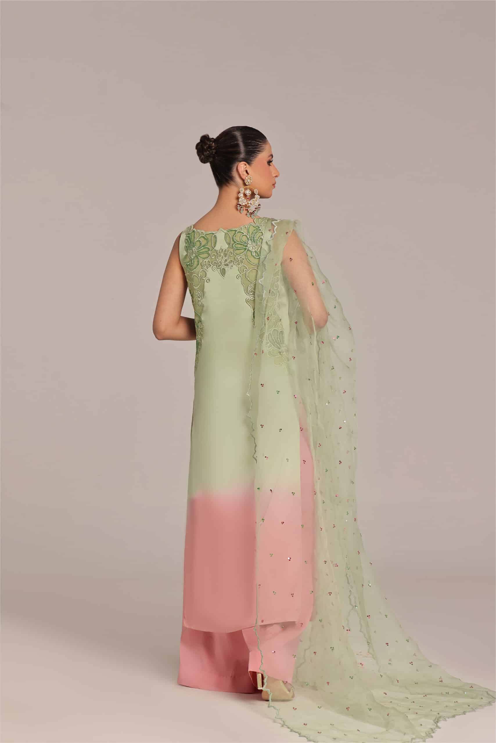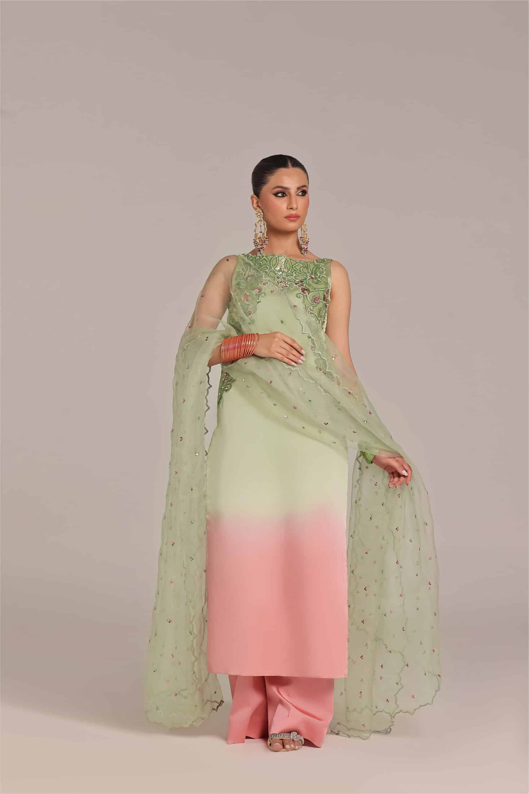 This ombre tone pink and mint green color straight shirt with Applique work technique details of the work is cutdana sequence pearls stones paired with pure organza dupatta with scallop details paired with loose pants.