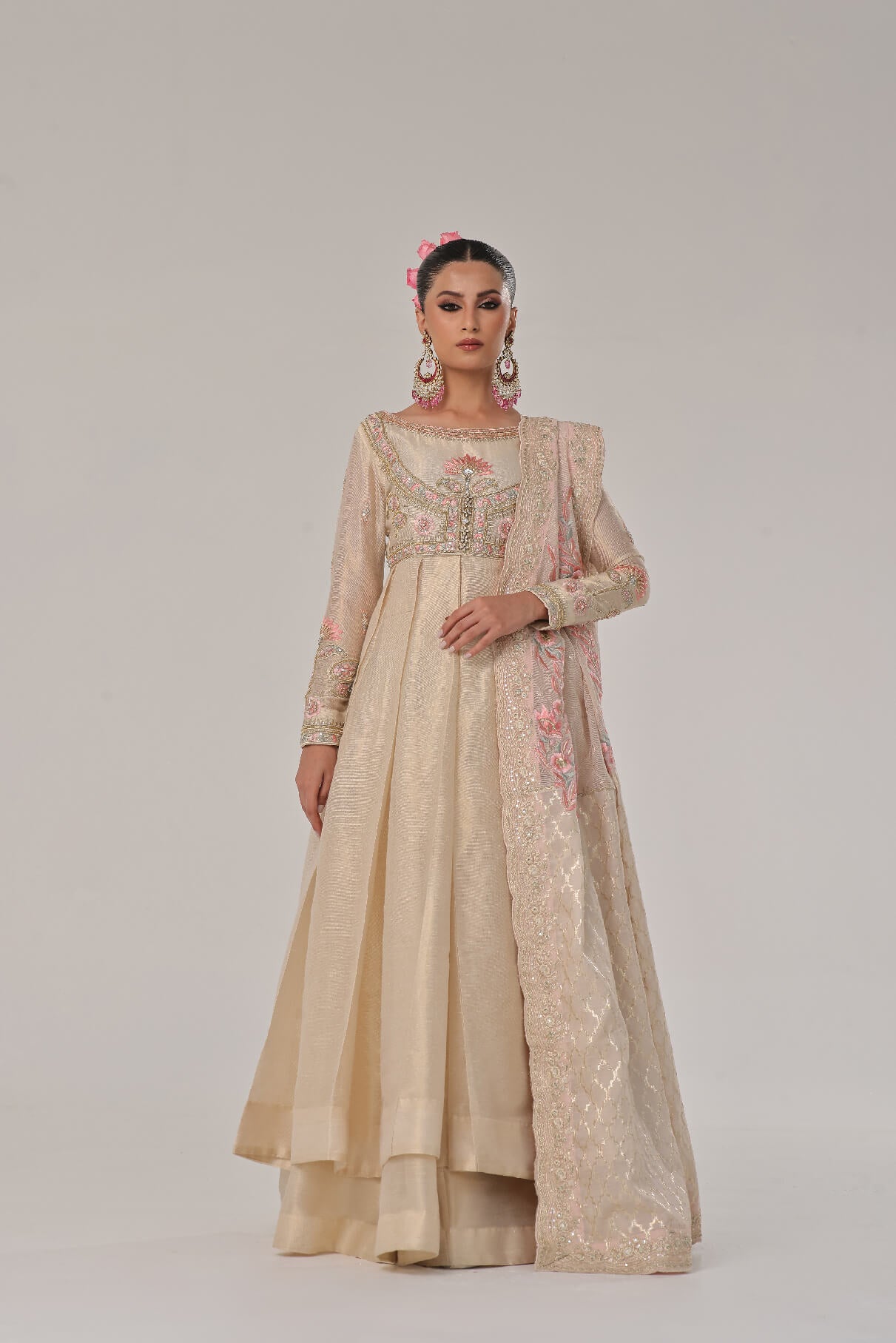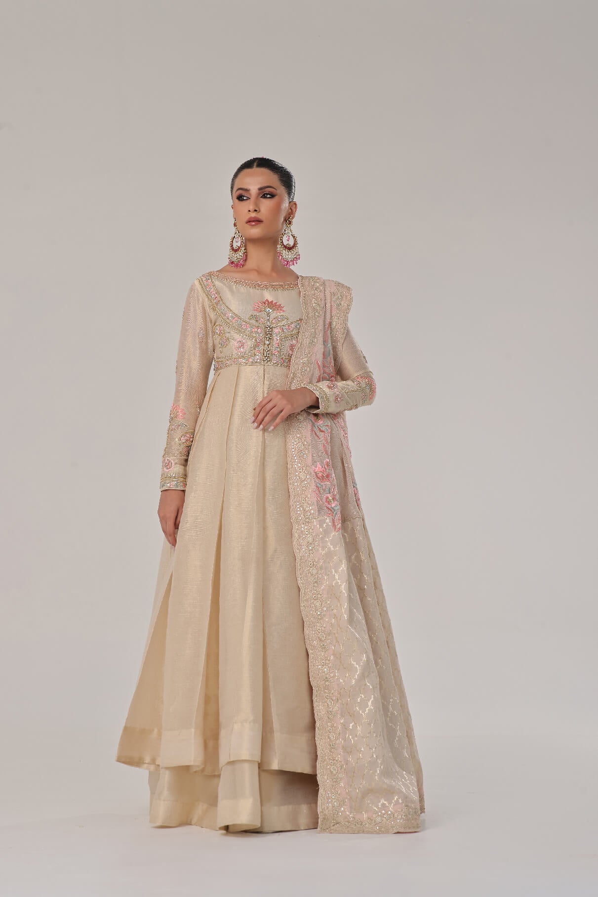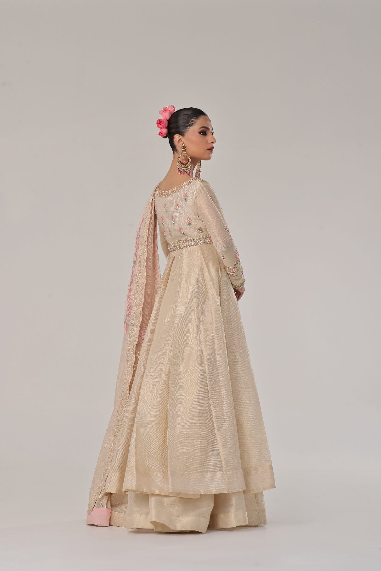 Gold & Ivory mysori Kalidar with hand embellished bodice & sleeves with thread work & kora naqshi & teeki stones paired with beautiful cotton silk & karanda dupatta with four side borders & colorful Embroidered bunches four sides sync with mysori plazo to complete the look with royalty.