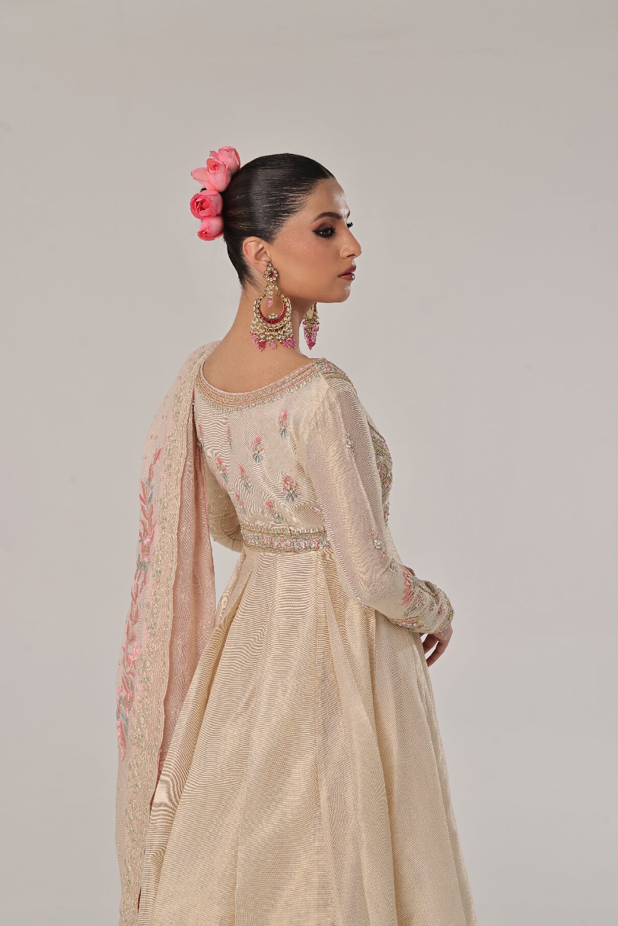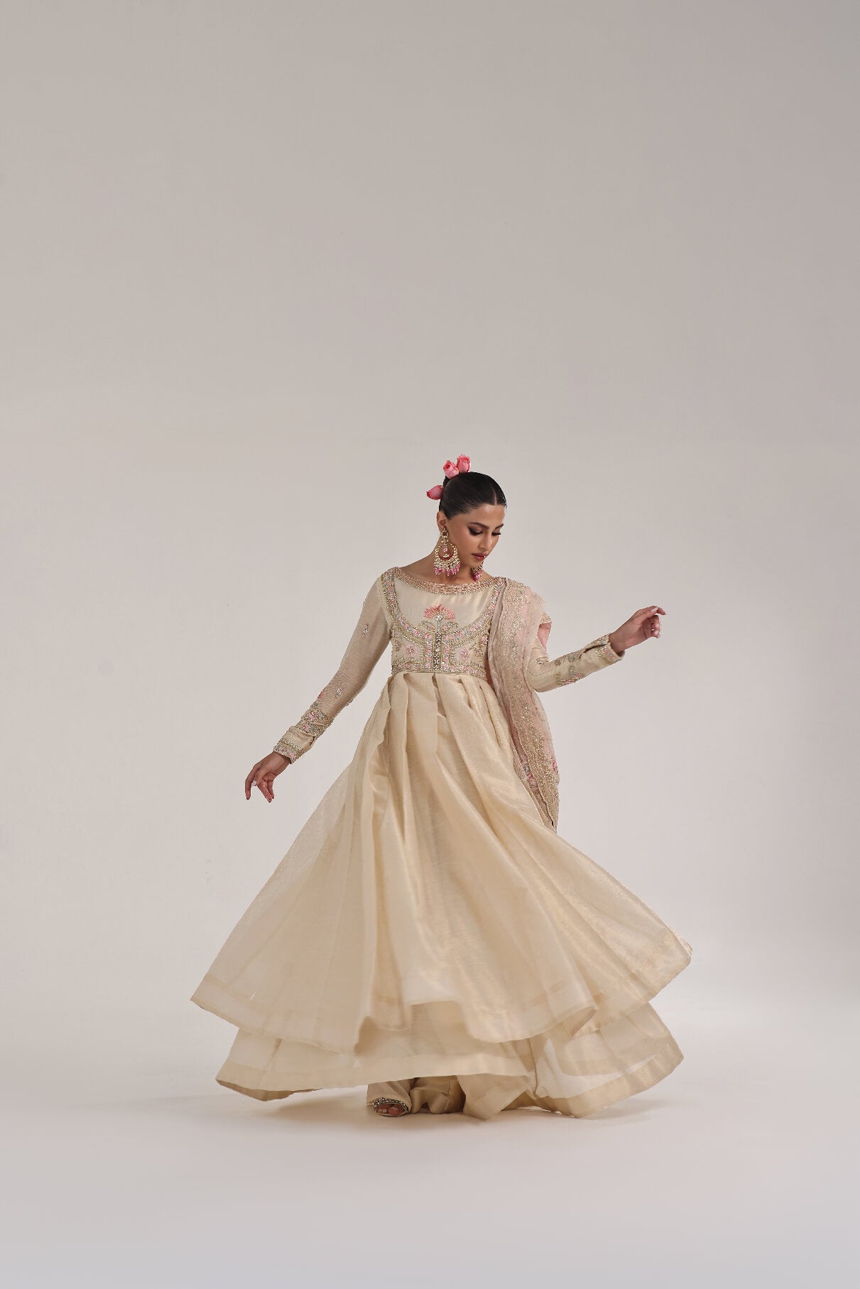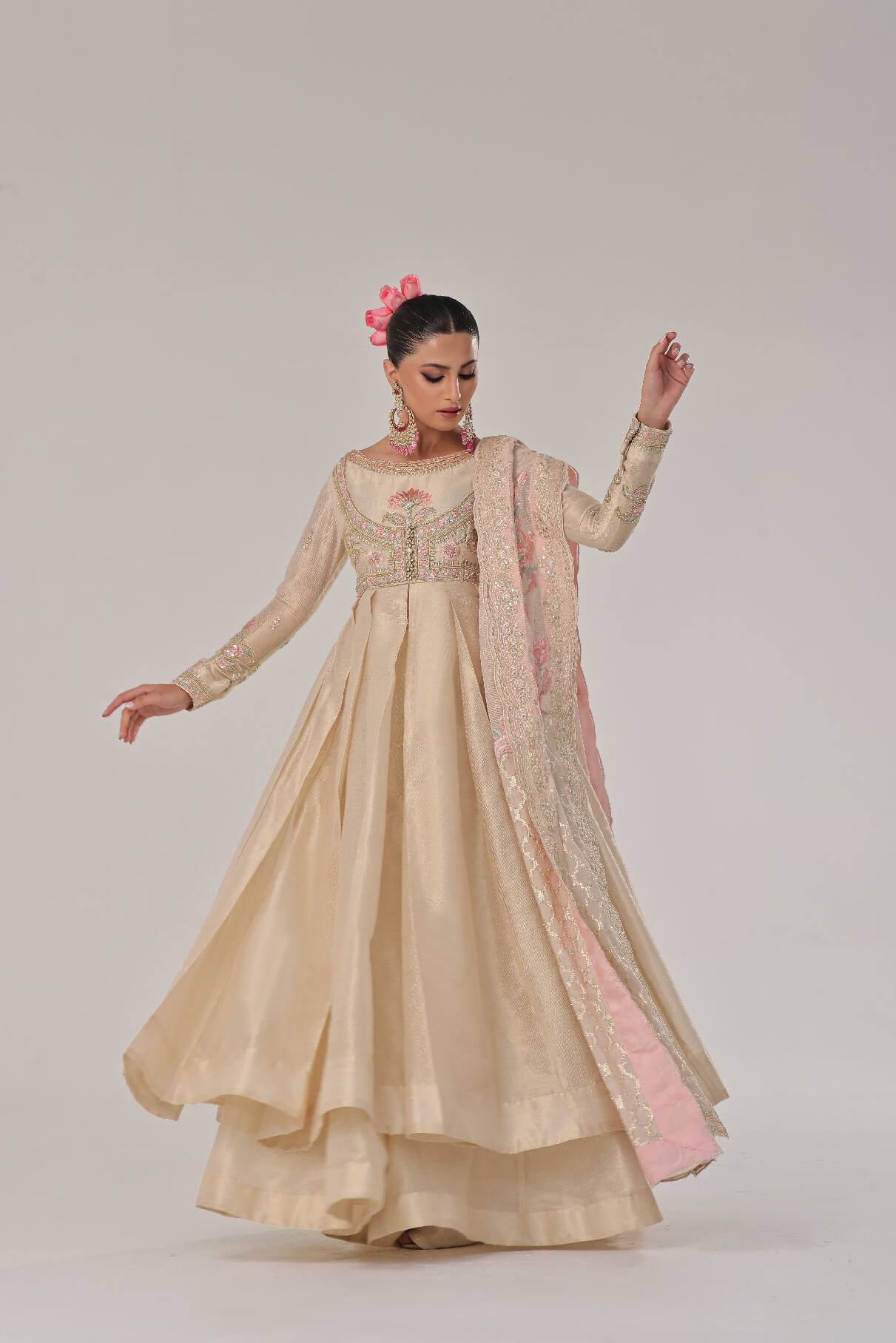Gold & Ivory mysori Kalidar with hand embellished bodice & sleeves with thread work & kora naqshi & teeki stones paired with beautiful cotton silk & karanda dupatta with four side borders & colorful Embroidered bunches four sides sync with mysori plazo to complete the look with royalty.