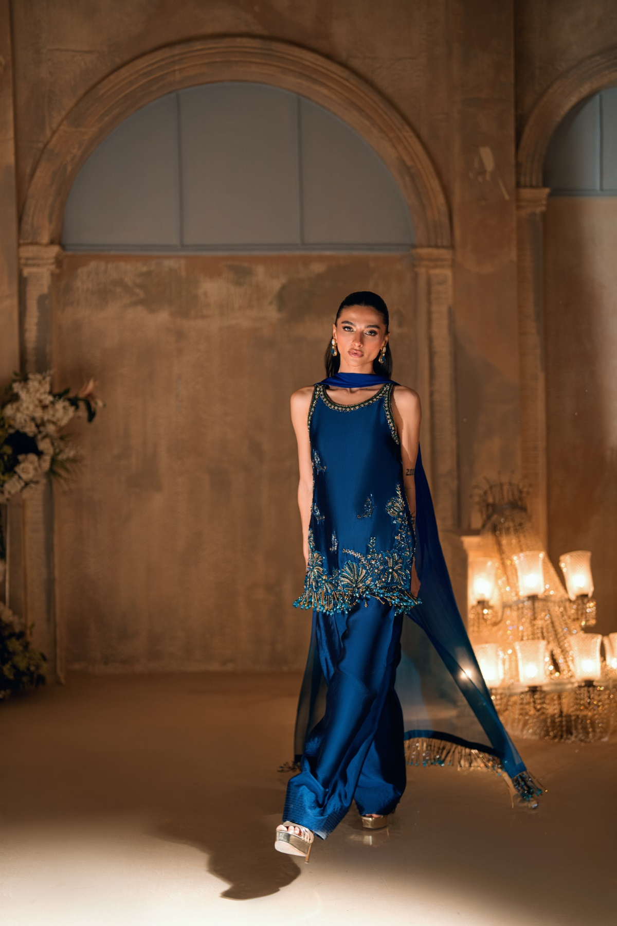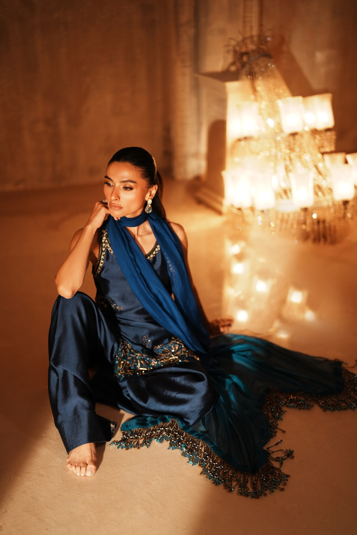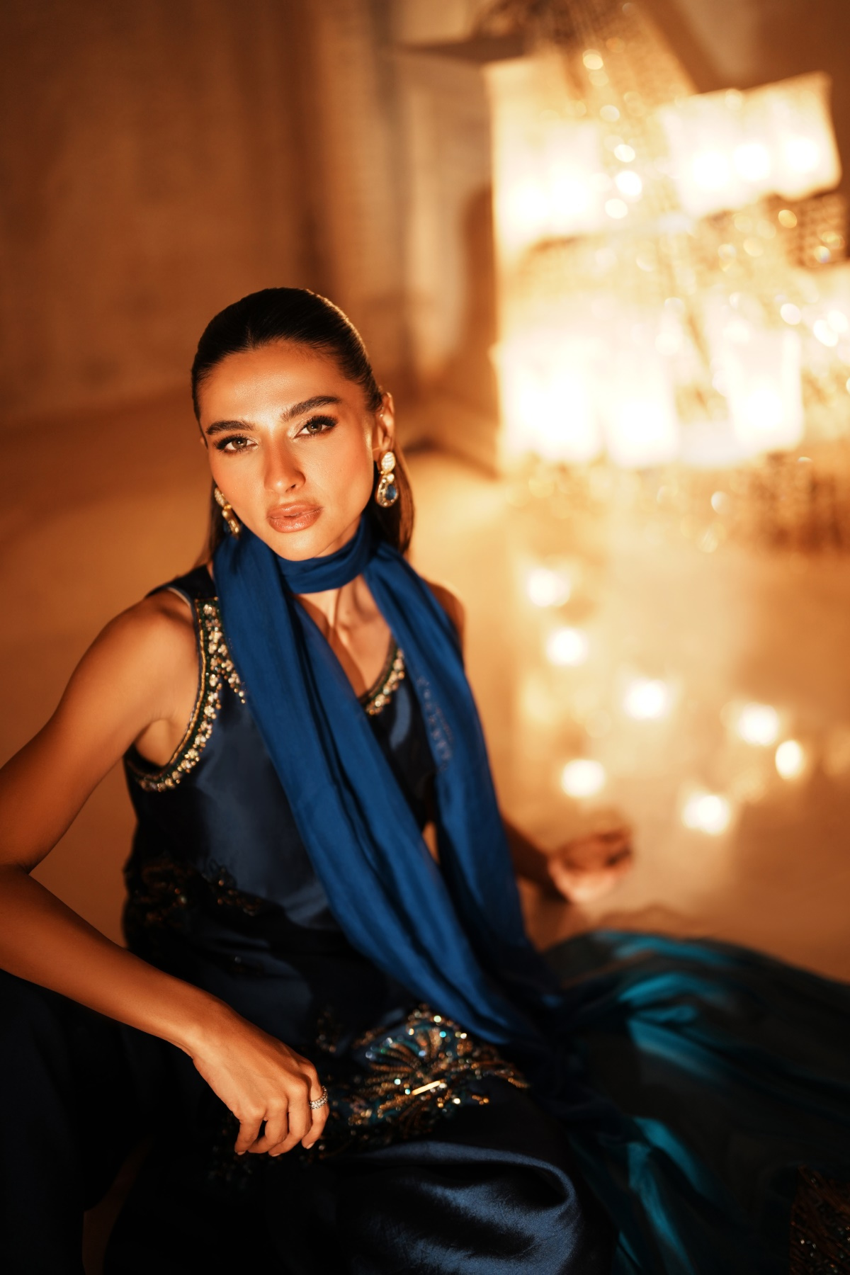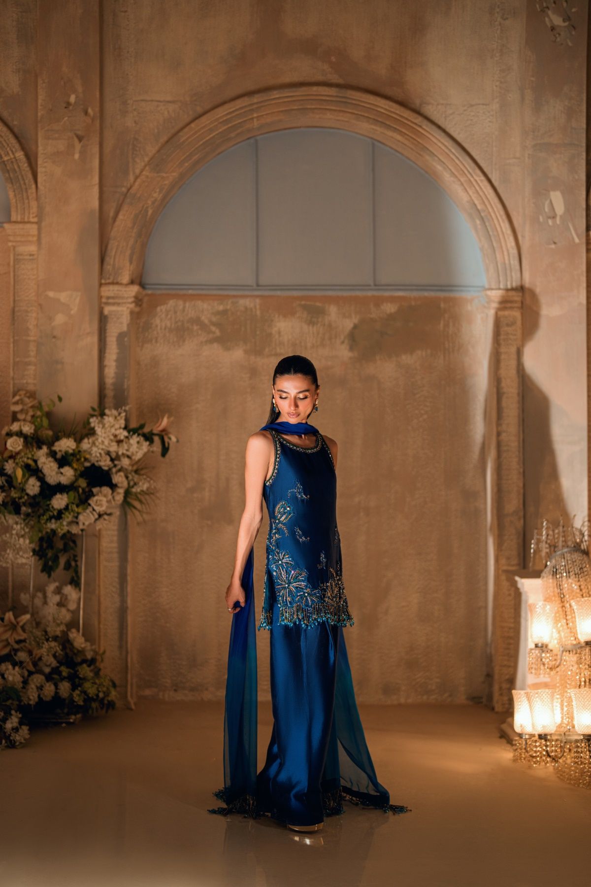 Jhil Mil is a striking dark blue sheesha silk ensemble, featuring a jewel-inspired neckline with intricate floral handwork in crystals, stones, cut dana, and dabka. Finished with a matching silk shalwar and a dual-tone chiffon dupatta with glimmering hangings, it radiates refined brilliance.