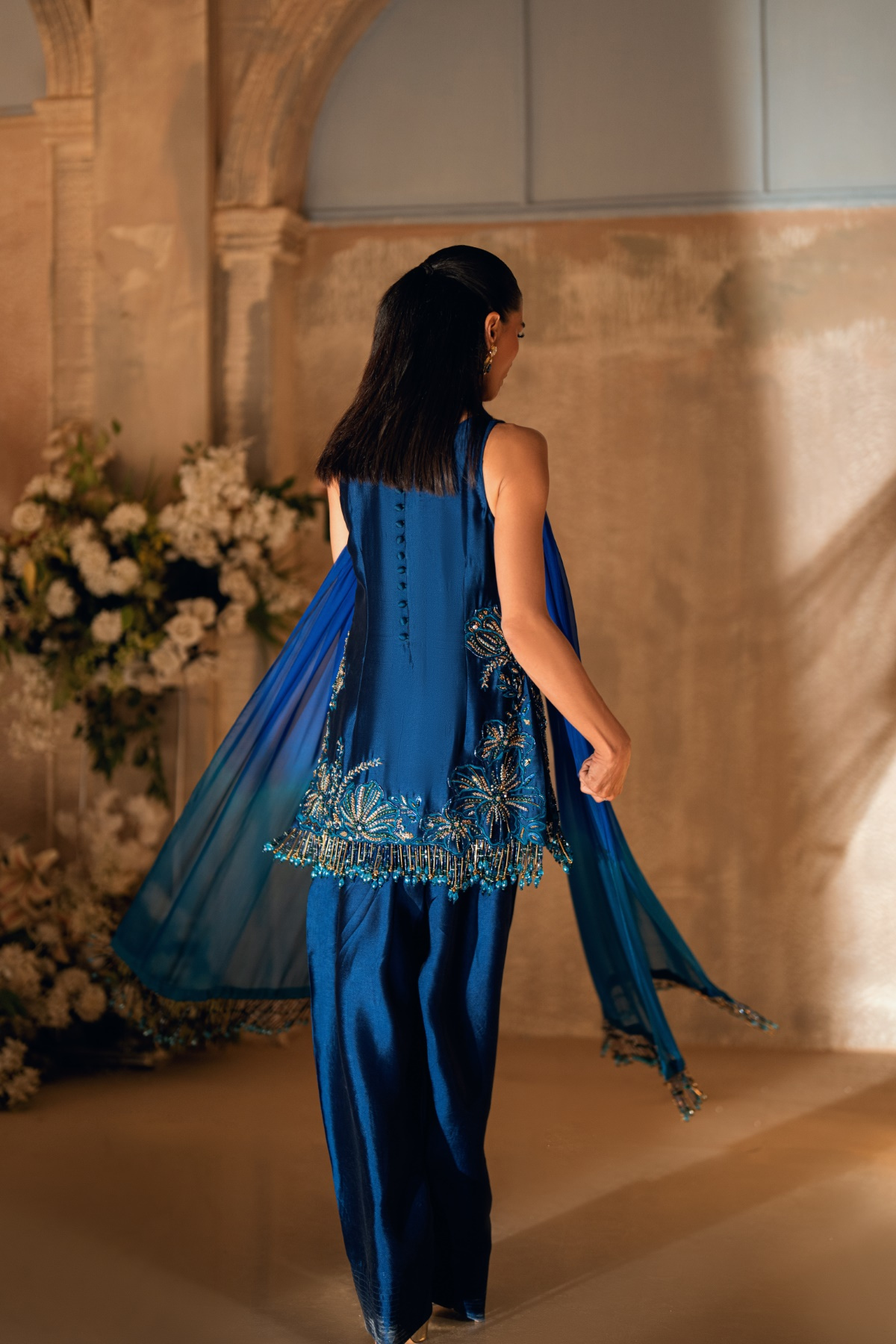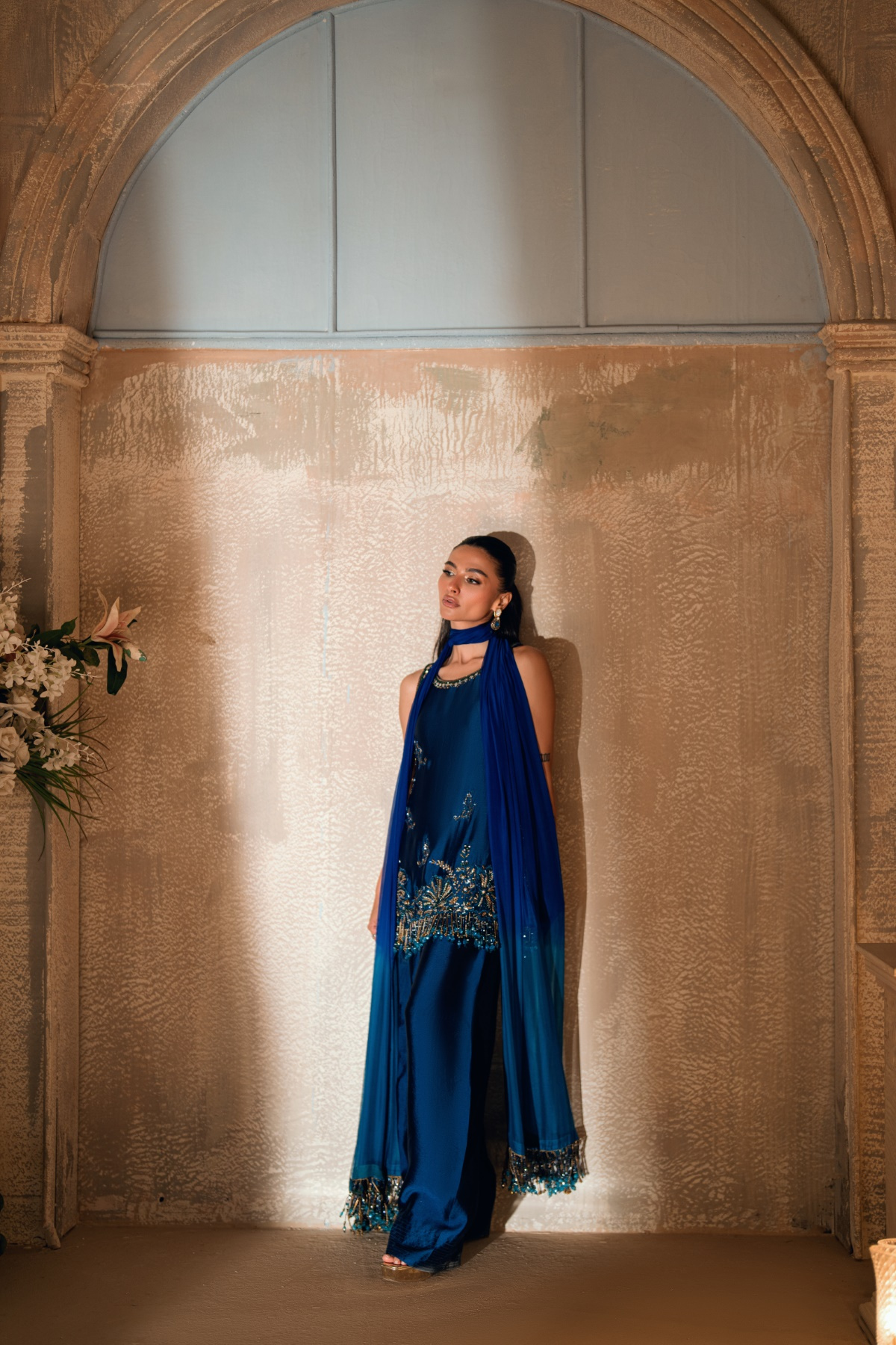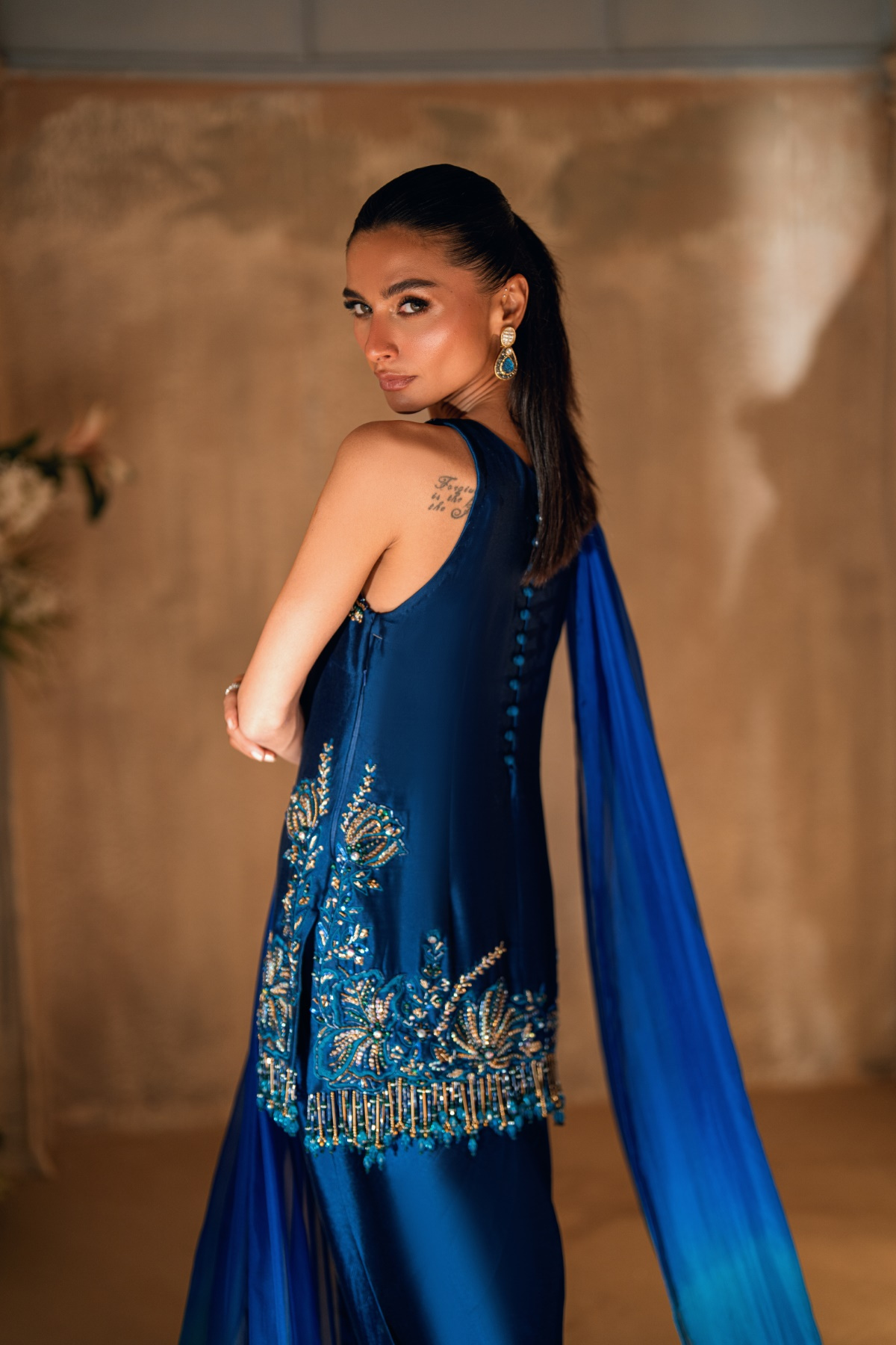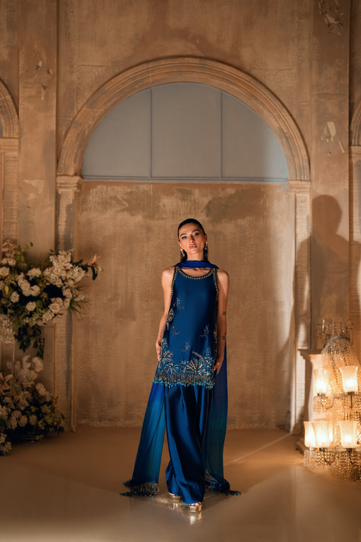 Jhil Mil is a striking dark blue sheesha silk ensemble, featuring a jewel-inspired neckline with intricate floral handwork in crystals, stones, cut dana, and dabka. Finished with a matching silk shalwar and a dual-tone chiffon dupatta with glimmering hangings, it radiates refined brilliance.