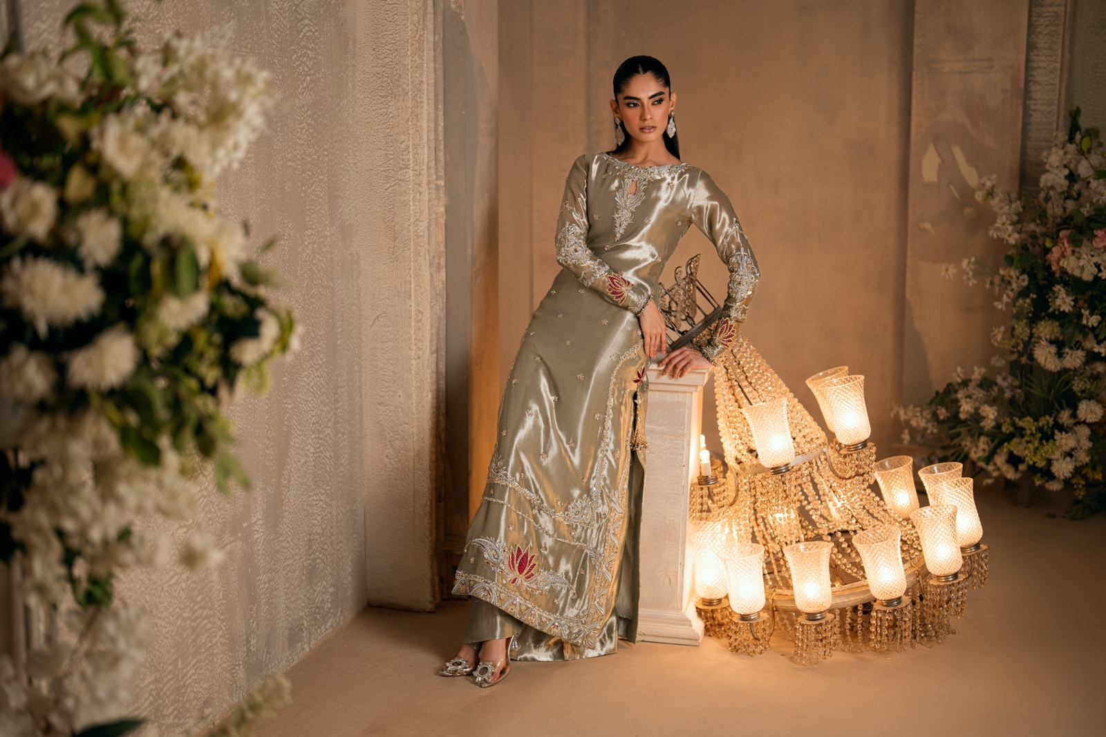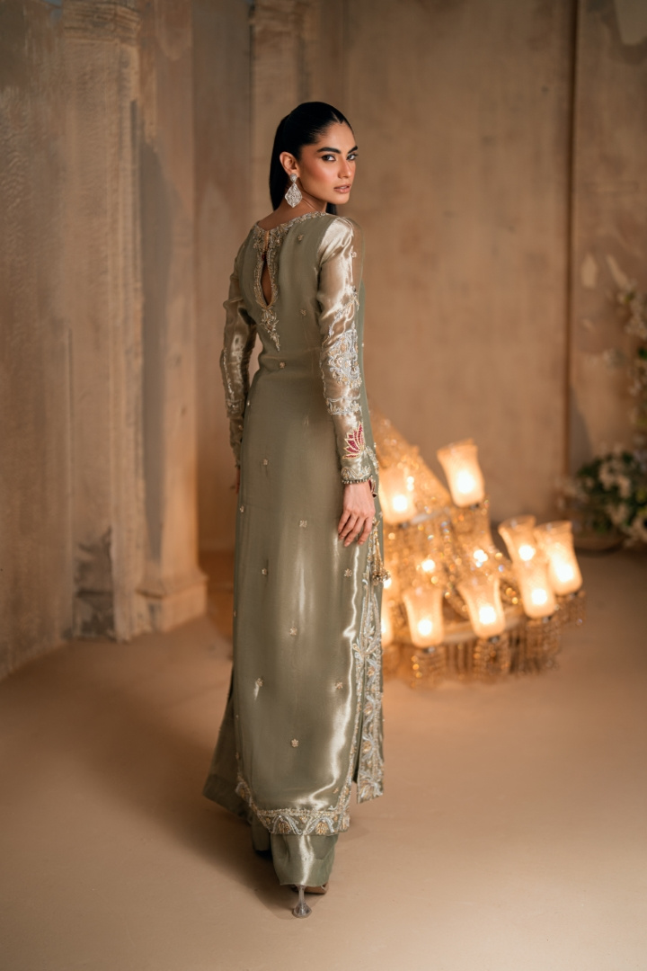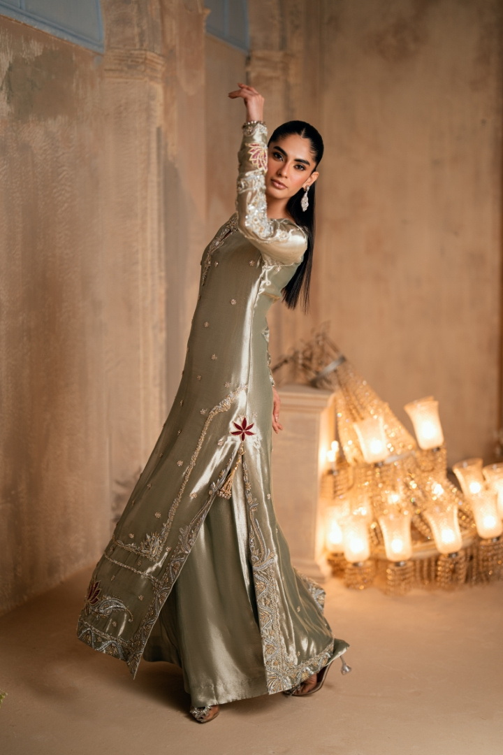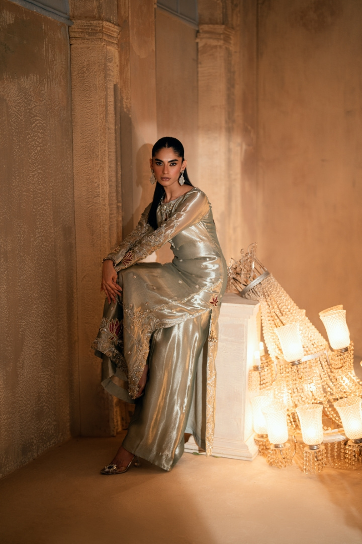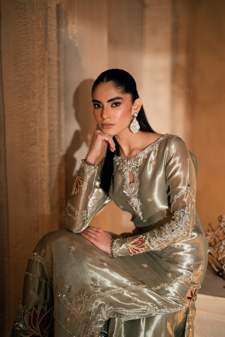 A refreshing masterpiece in minty green lama fabric, The Mehak features a stunning mix of gold and silver embroidery centered around intricate lotus motifs. Adorned with silver ghungroos on the sleeves and elegant tassels on the side chalks, this long shirt is paired with a dual-bordered organza dupatta for a look of radiant elegance.