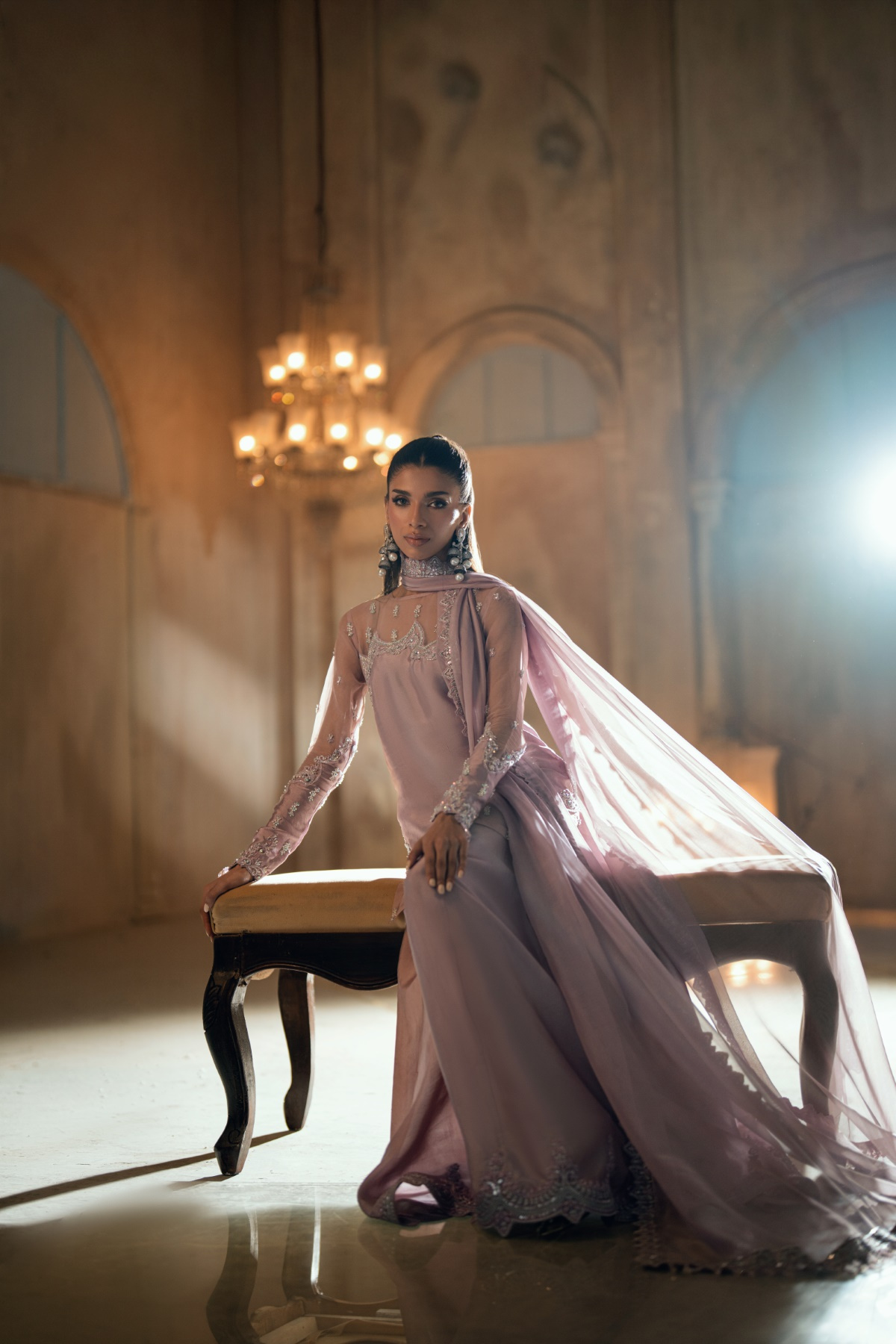 Mehmal is a refined mauve sheesha silk ensemble, adorned with intricate hand embroidery in cut dana, crystals, and stones. Finished with embroidered plazos, a silk chiffon dupatta, and a signature butterfly hanging, it embodies modern elegance with a poetic soul.