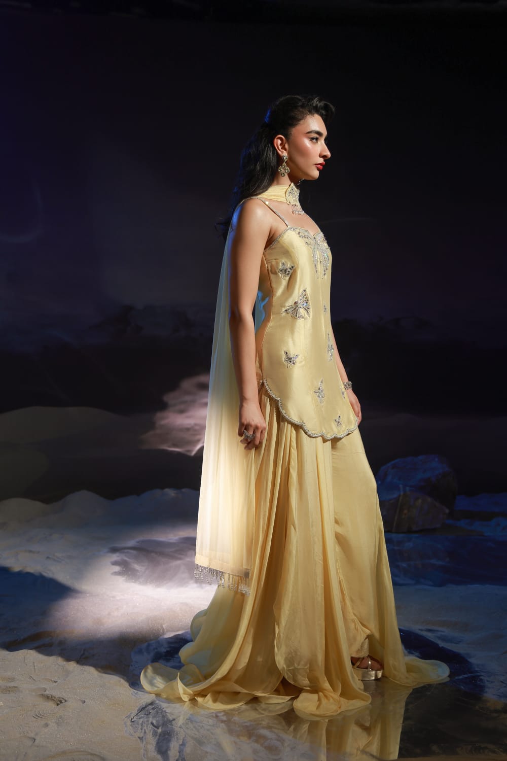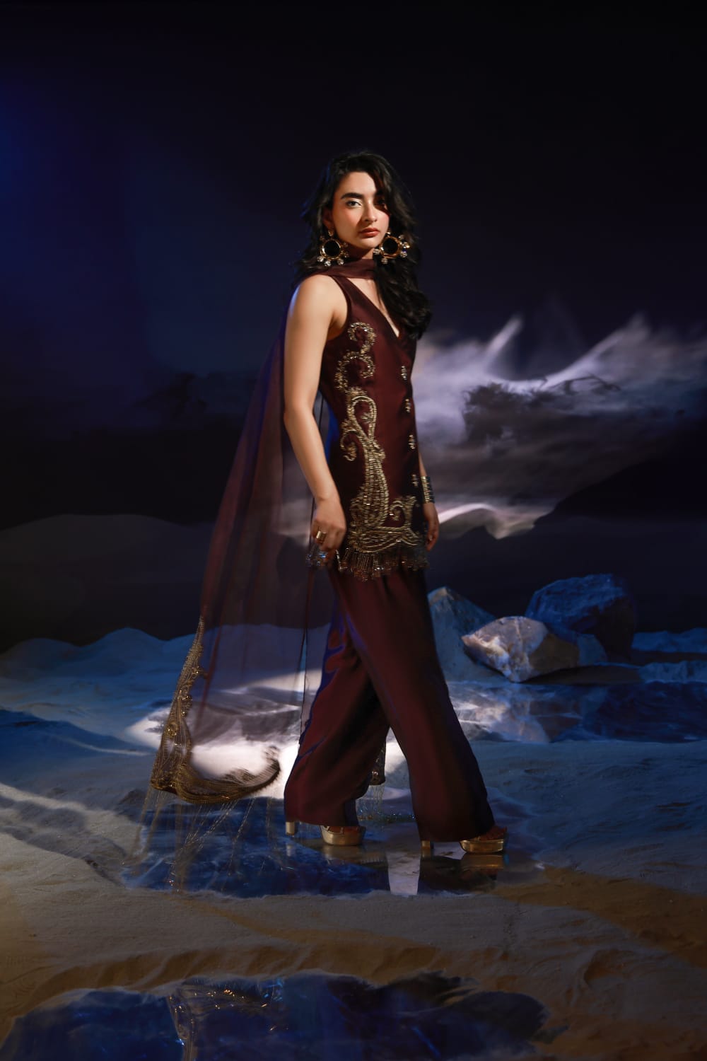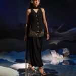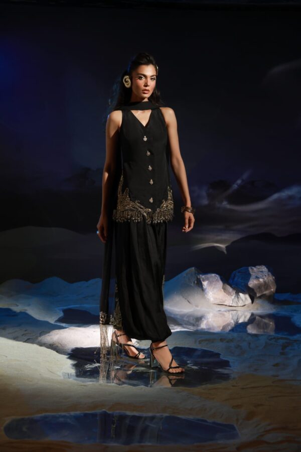 Mystique is a bold black luxury ensemble featuring an embellished waistcoat paired with statement balloon pants. Finished with gold detailing, kundan buttons, and a chiffon dupatta with dramatic golden danglings, it embodies modern glamour with regal appeal.