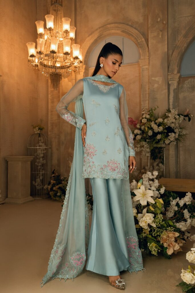 Noor is a luminous white sheesha silk ensemble, adorned with paisley-inspired hand embroidery in dabka, nakshi, stones, and pearls. Finished with organza accents and a delicately bordered dupatta, it embodies timeless grace and quiet opulence.