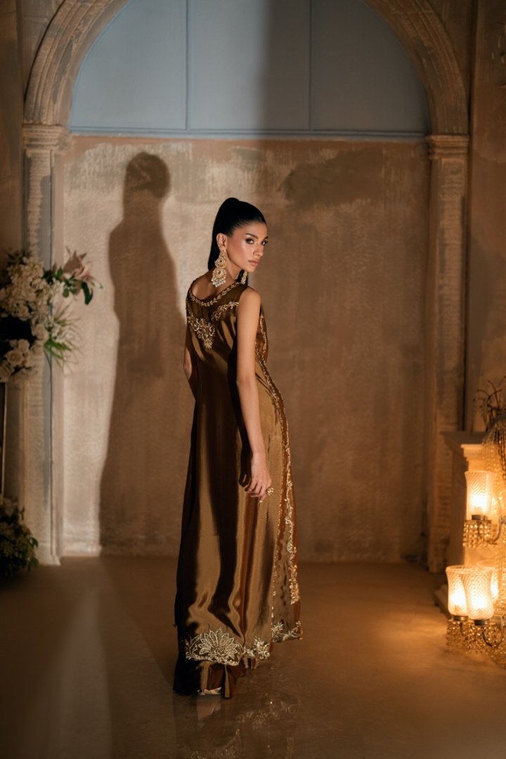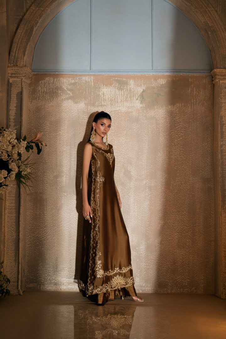 A vision in rich brown sheesha silk, The Sandal by Wajahat Mansoor defines sophistication with its double-framed front embroidery and detailed organza neckline. Featuring a back hem border and a four-sided embroidered organza dupatta tipped with ghungroos, it is a graceful silhouette from the Khuab collection.