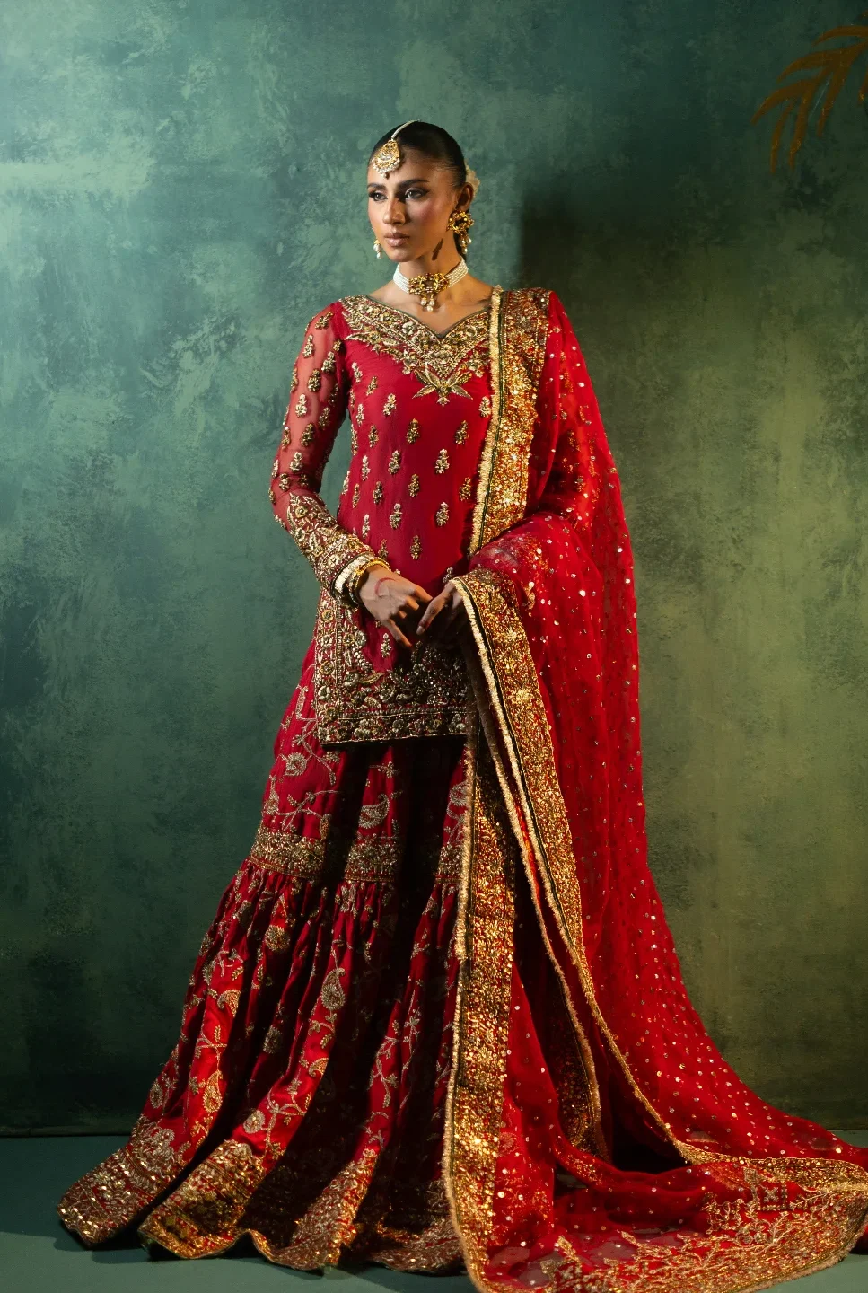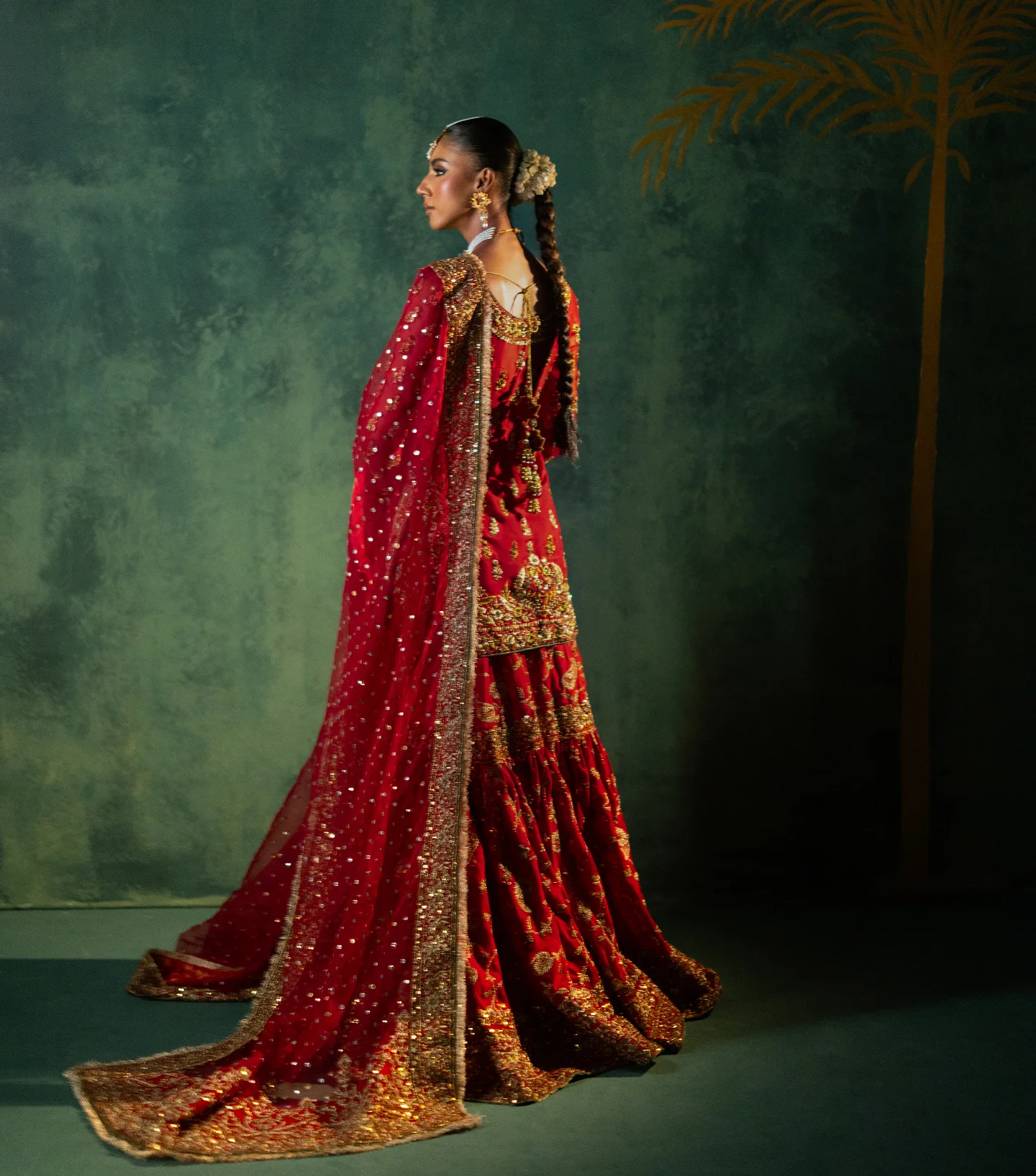 The Surkh is a modern ode to timeless tradition. This classic short silk shirt carries the weight of heritage in every stitch, adorned with intricate handwork of kora, dabka, naqshi, and tikki stones that shimmer with understated elegance. Paired with a heavily embellished gharara, the ensemble commands attention without losing its…