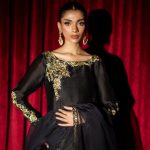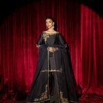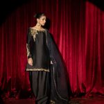 This royal black short shirt and shalwar is complete package of handwork and tilla work on neck line daman and on sleeves paired with pure katan organza dupatta.