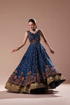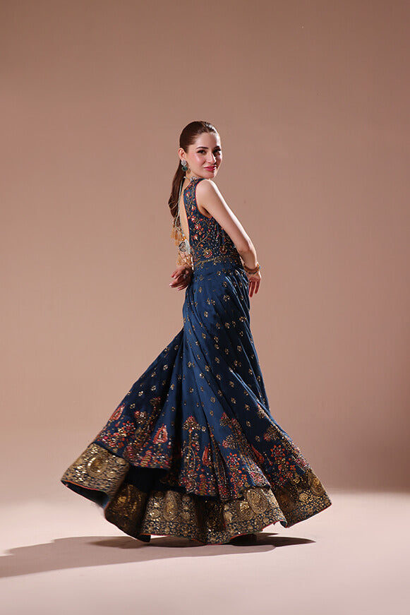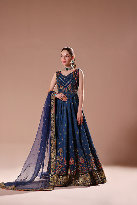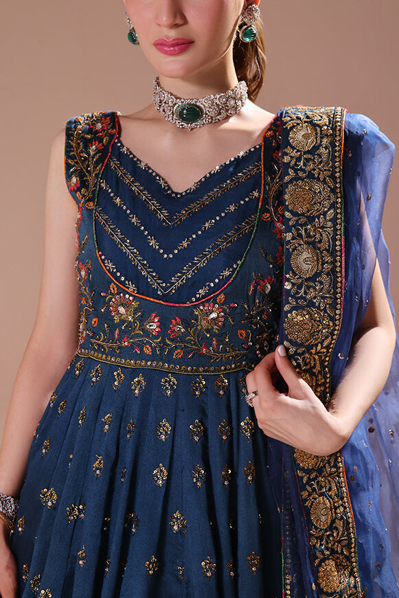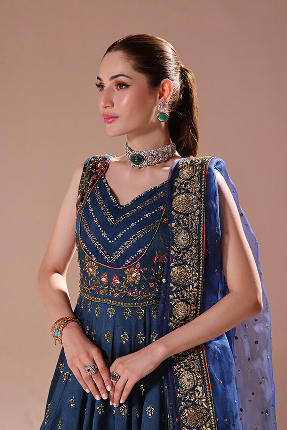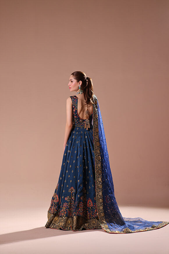 A traditional double layered pishwas with flourescent colors used to make it look elegant yet colorful, merged with sona gold color to make it more royal. Threadwork & adda work used to make it richer. Chatapati been used to give extra traditional touch.