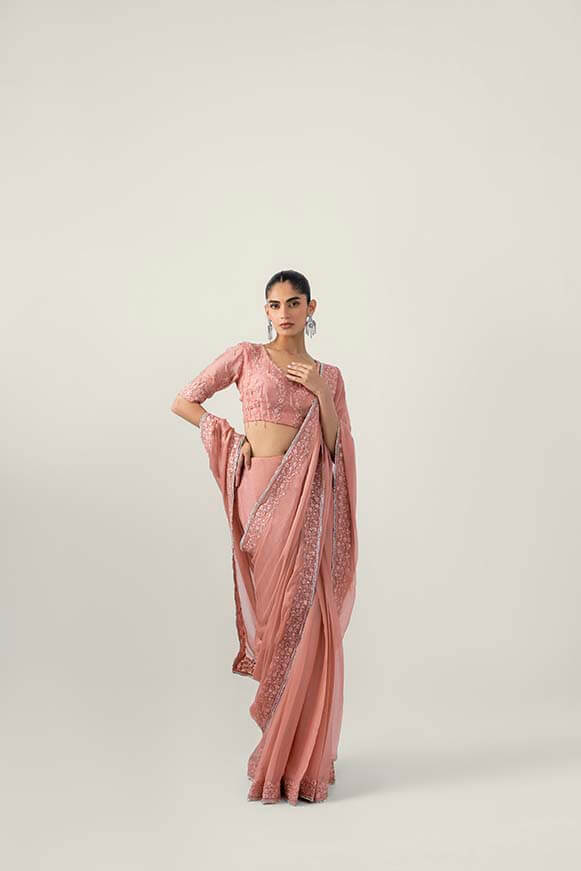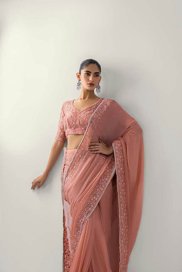 A chic pure silk chiffon saree with all side thread work and stones borders And detailed zardozi blouse Saree will be stitched on customise measurements