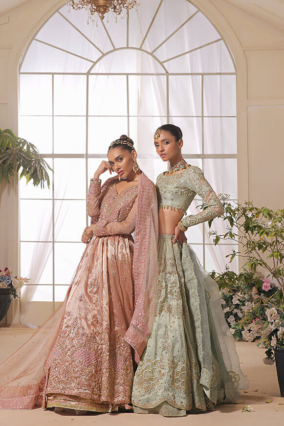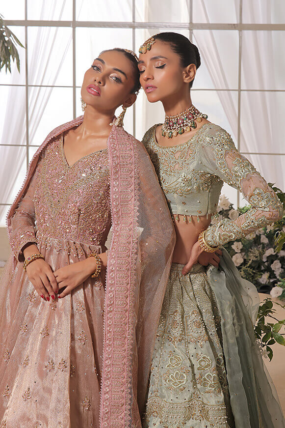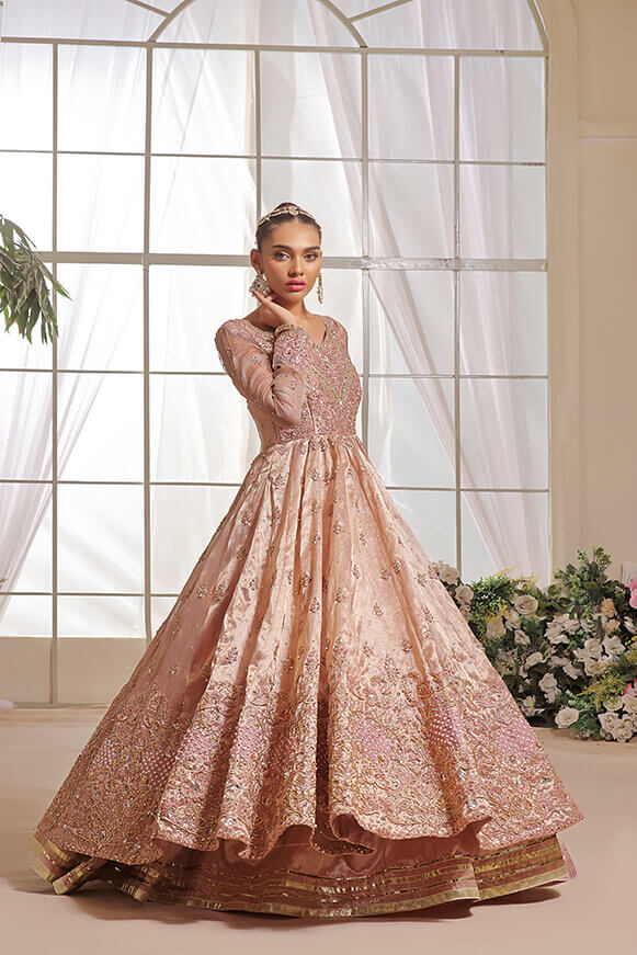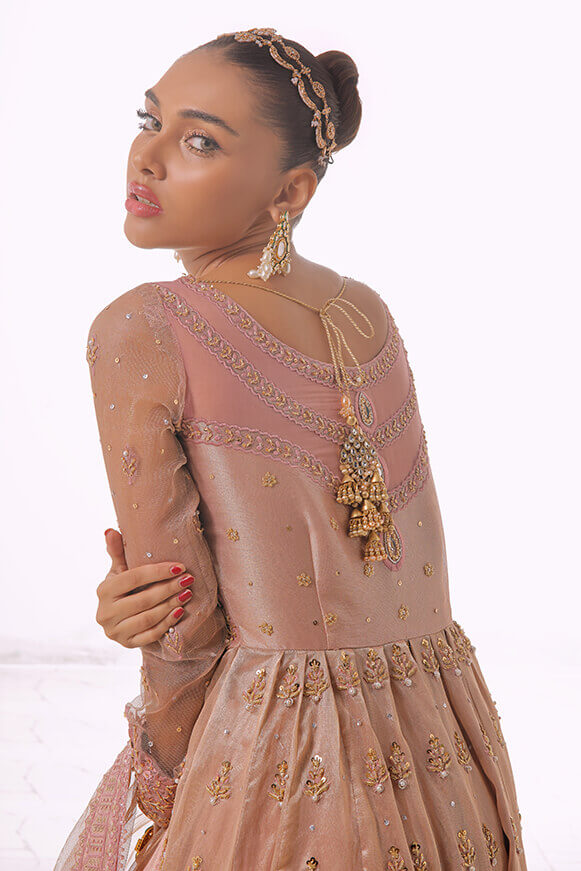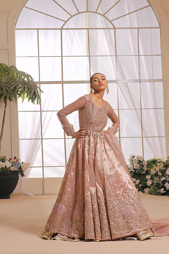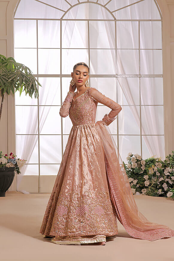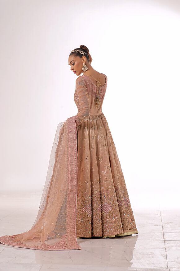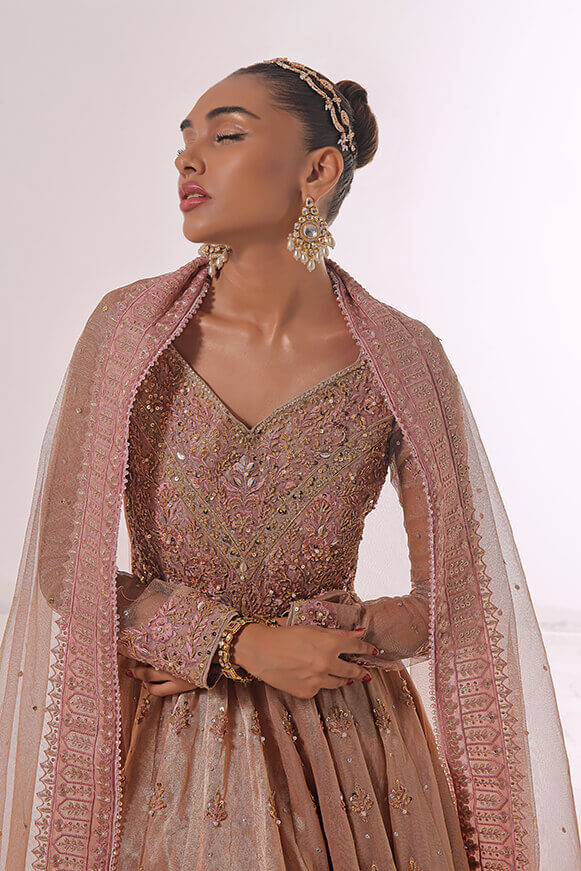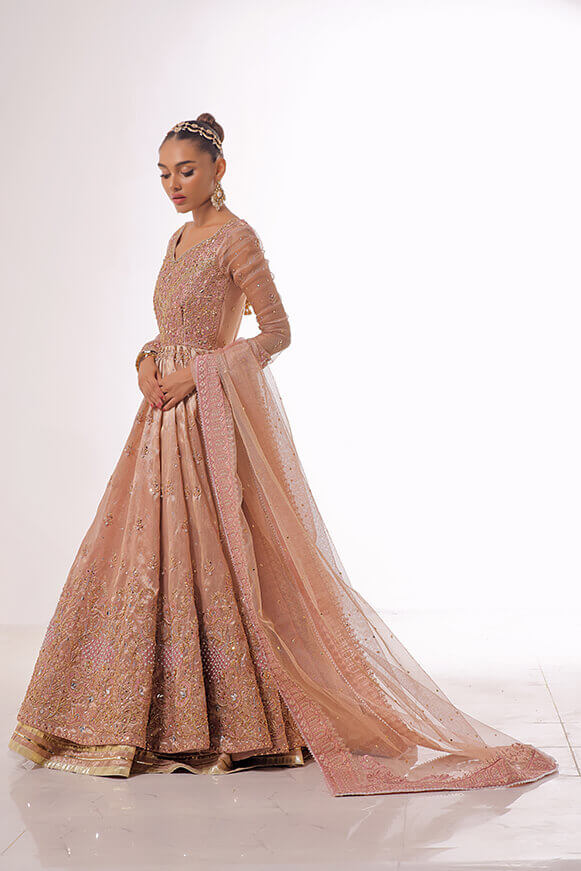 A beautifully hand crafted Pishwas with detailed handwork on borders & on bodice with 10 yards flare. Paired with mysori net 3.75 yards dupatta and silk lehenga.