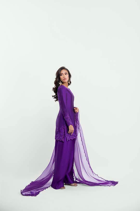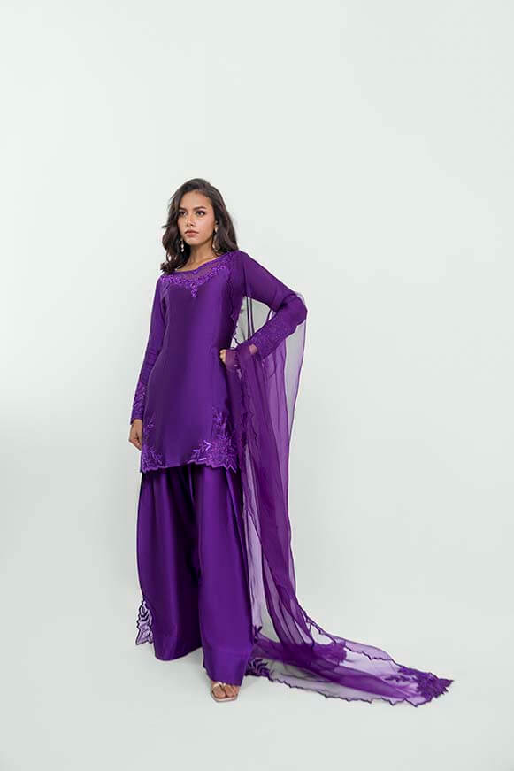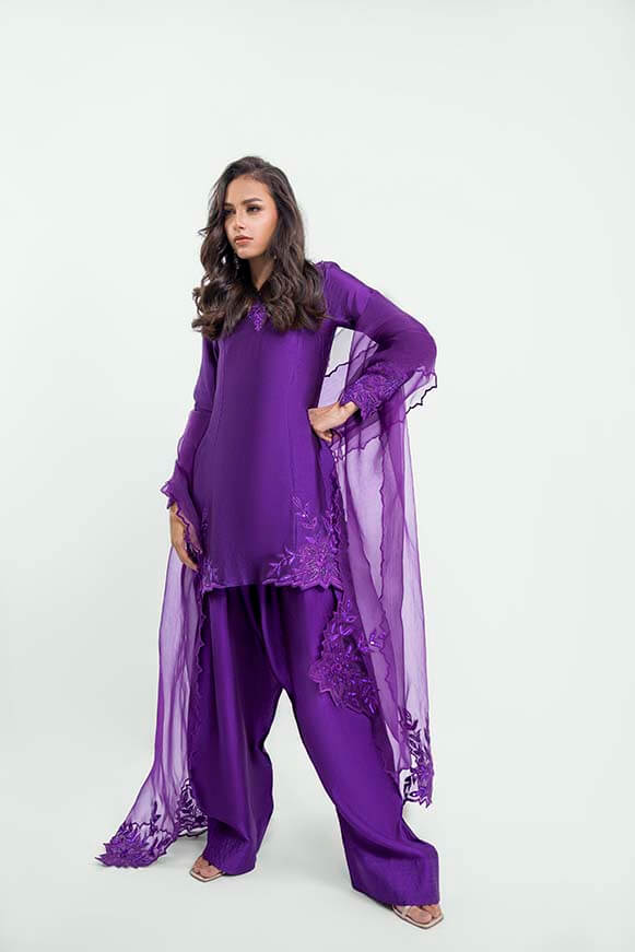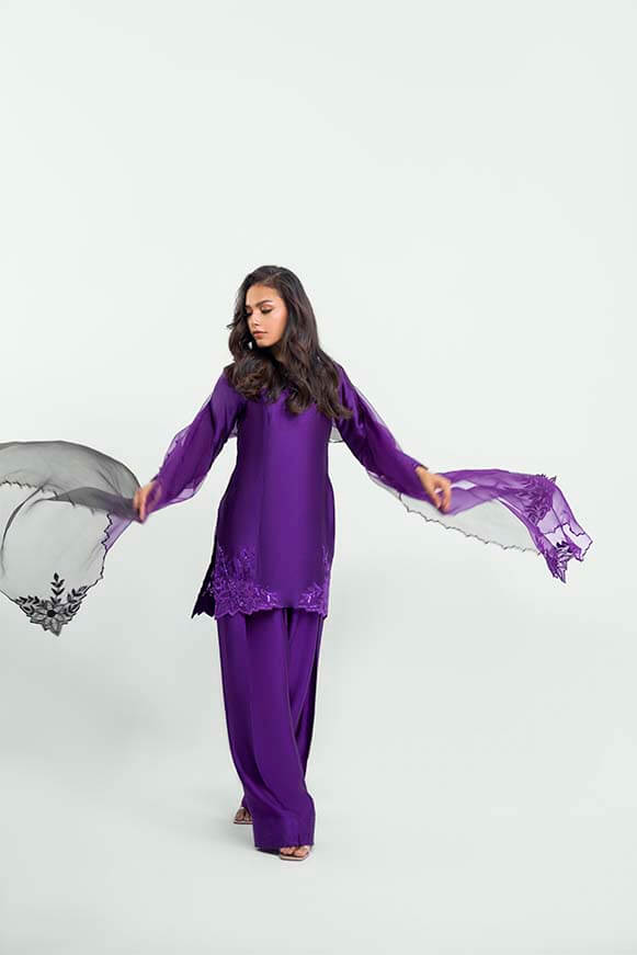 Short shirt with applique work on neck line and daman with stones and crystals been used.