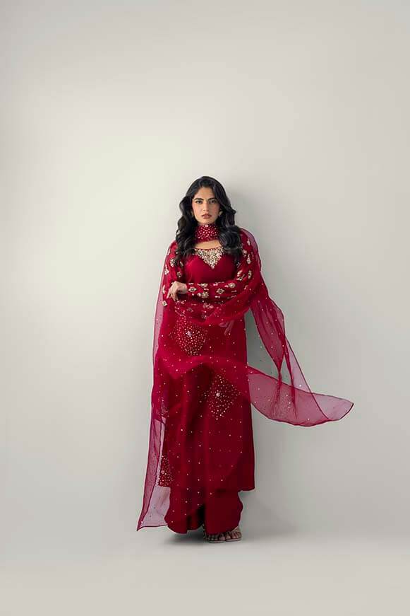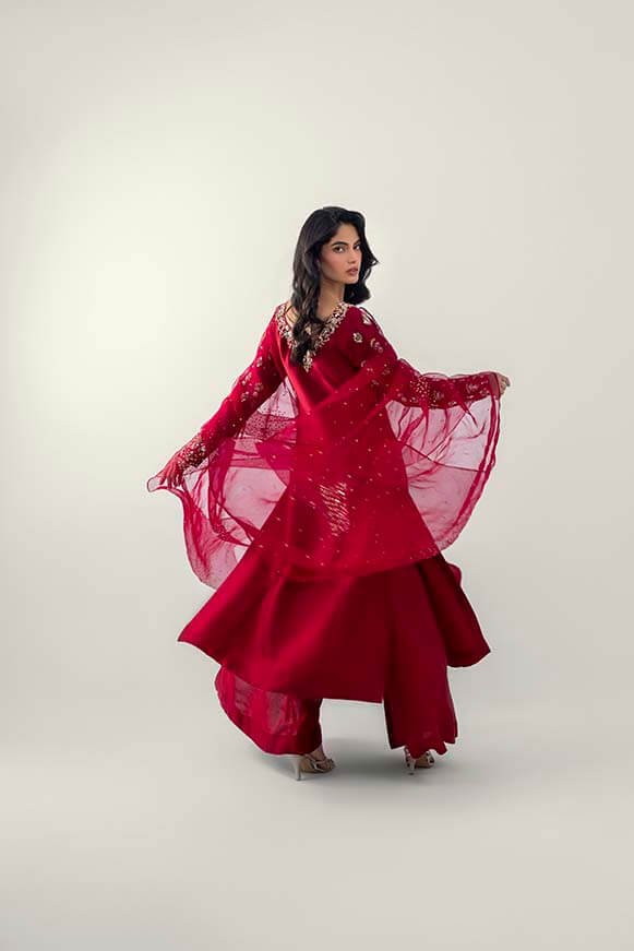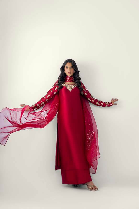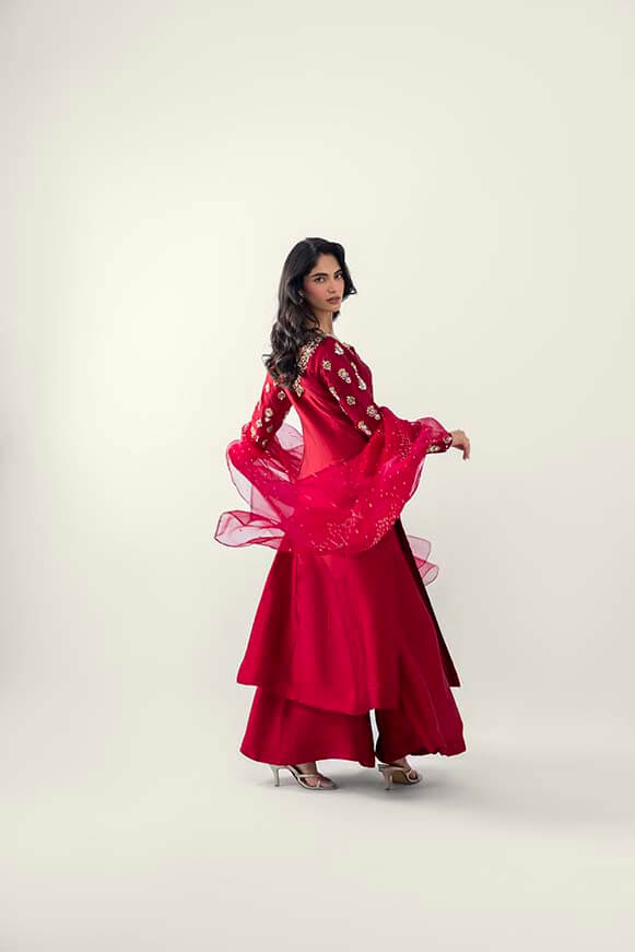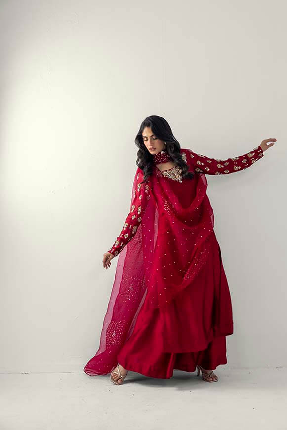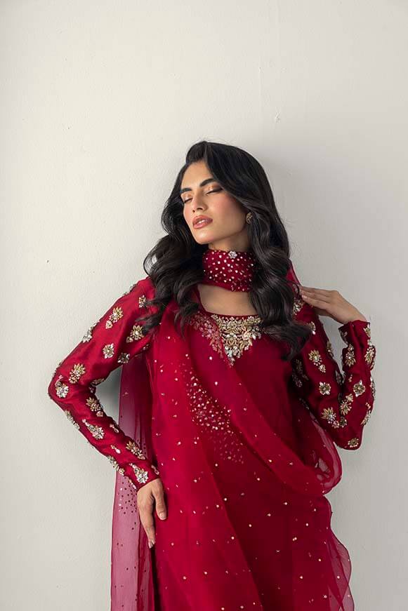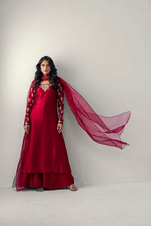 A line long shirt with detailed zardozi work on neck line and sleeves Paired with pure organza dupatta with zardozi work