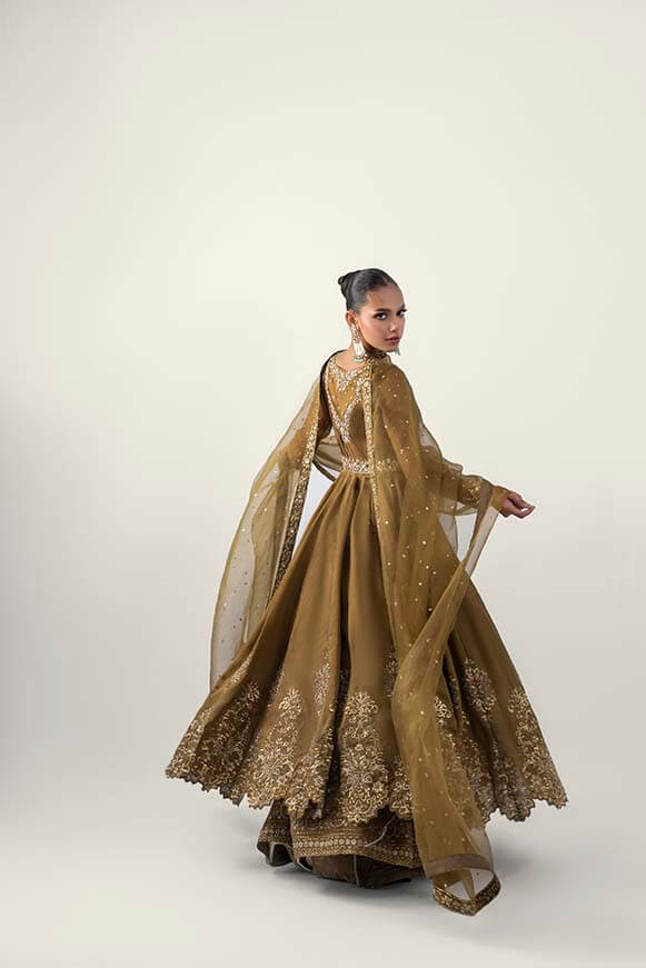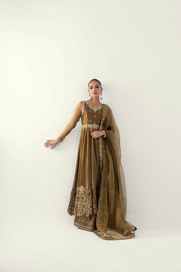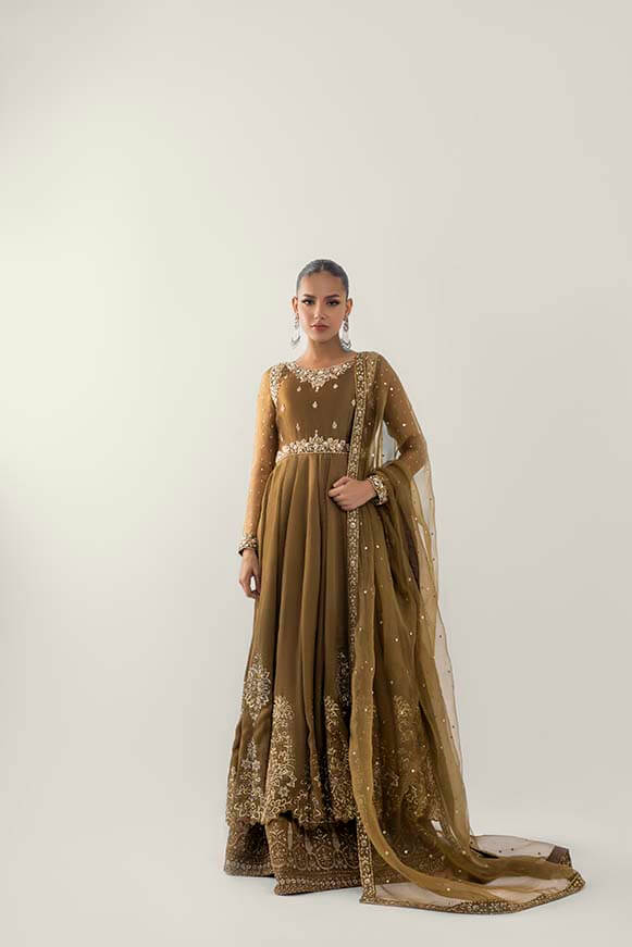 A beautiful mehndi colour pishwas zardoz work on neck line and sleeves and thread work on flare with sequence paired with plazos and pure organza dupatta.