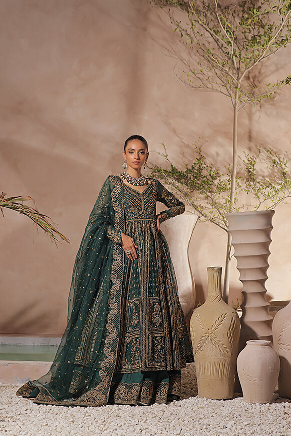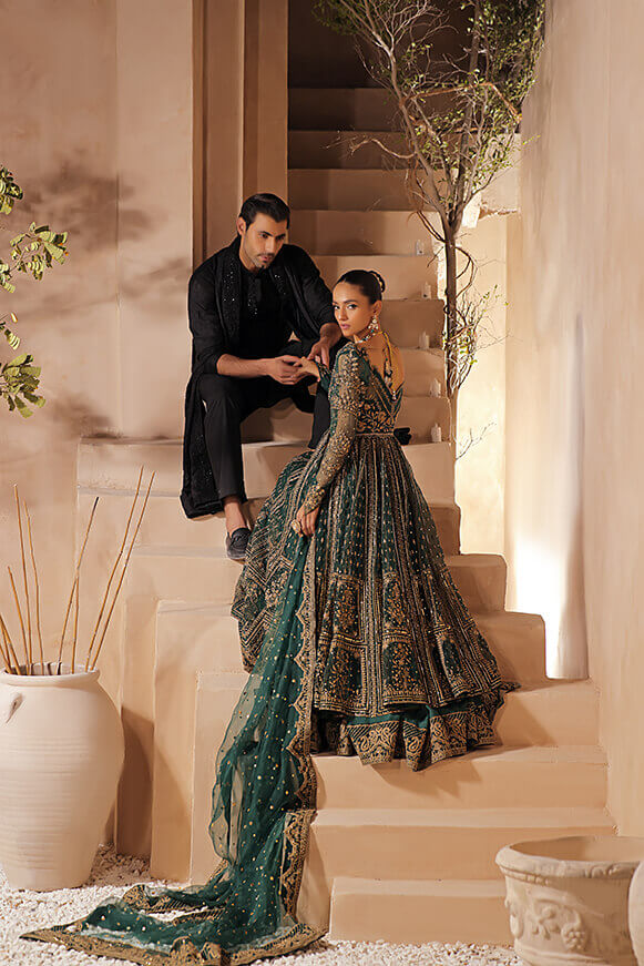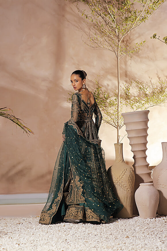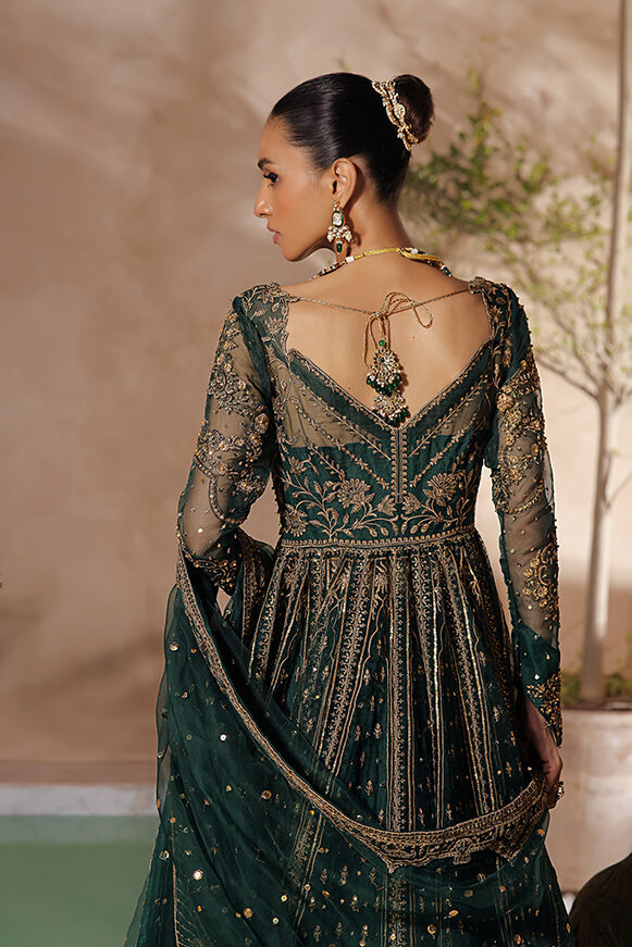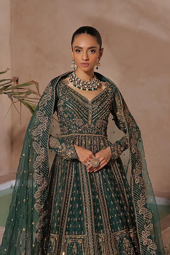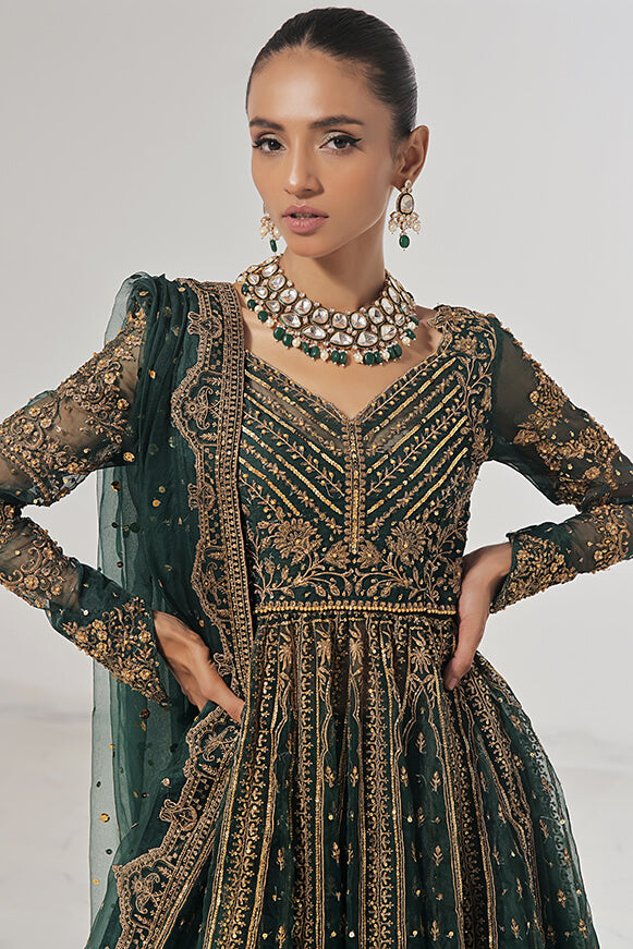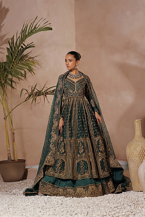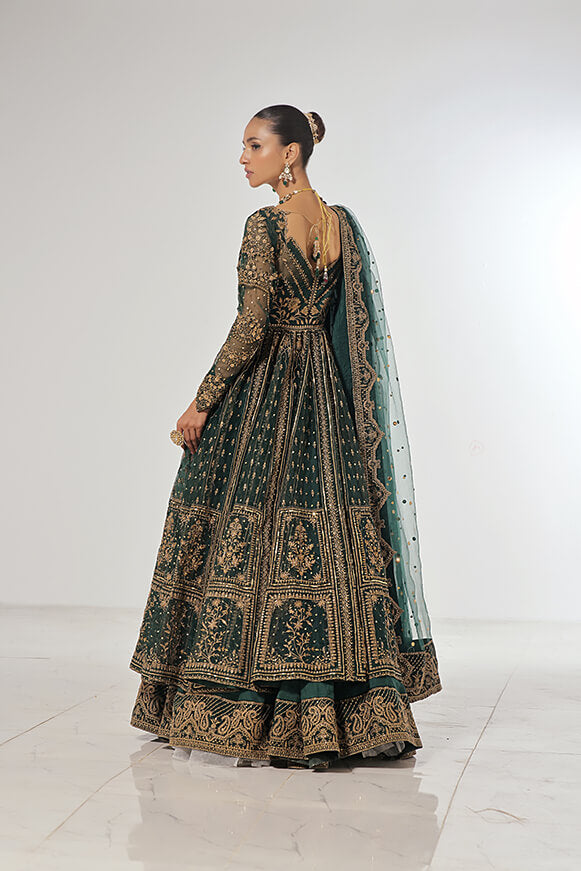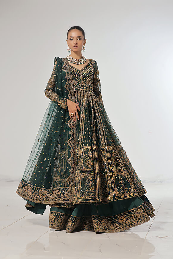 An emerald green outfit with extreme intricate work on Pishwas using oxidize gold color with 10 yards flare and pishwas, 3.75 yards of dupatta and paired with silk lehenga.